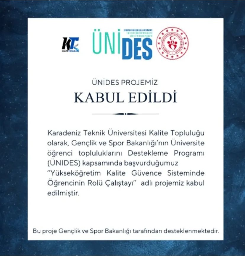 Karadeniz Teknik Üniversitesi Kalite Topluluğu olarak, Gençlik ve Spor Bakanlığının Üniversite Öğrenci Topluluklarını Destekleme Programı (ÜNİDES) kapsamında başvurduğumuz “Yükseköğretim Kalite Güvence Sisteminde Öğrencinin Rolü Çalıştayı” adlı projemiz kabul edilmiştir.