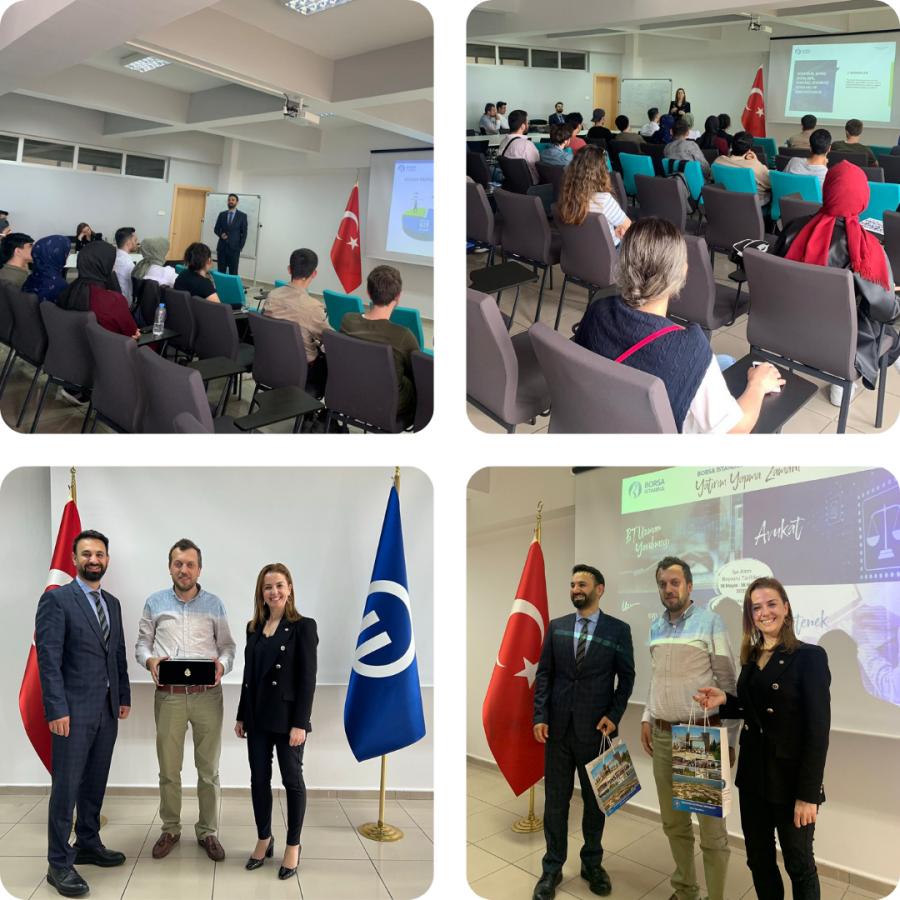 Etkinlik Yetenek Yönetim ve Eğitimi Direktörü Dr. Ersin GEYİK’in Borsa İstanbul hakkında genel bilgilendirme yapmasıyla başladı. Ardından Borsa İstanbul’un iş imkanları, bu iş imkanlarından nasıl yararlanılabileceği ve bu iş imkanlarından yararlanabilmek için hangi niteliklere ve eğitimlere sahip olunması gerektiği konusunda bilgi verdi. Denetim Gözetim Kurulu Başkan Yardımcısı Şebnem YÜCEL Borsa İstanbul’un BT Uzman Yardımcısı, Uzman Yardımcısı, Denetçi Yardımcısı işe alım sınavı hakkında bilgilendirilmeler yaptı. Etkinlik KM Müdür Yrd. Öğr. Gör. Ahmet KÜÇÜK’ün konuşmacılarımızla hediye takdim etmesiyle sonlandırıldı.