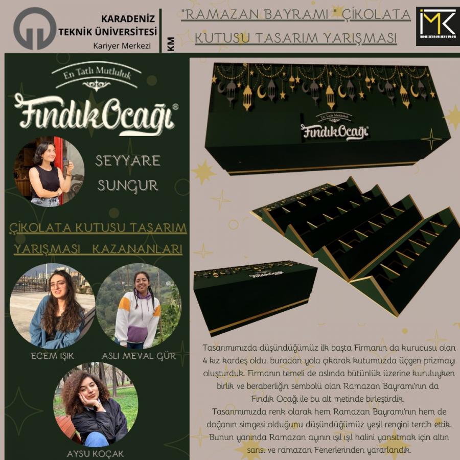 Fındık Ocağı firmasının, KTÜ Kariyer Merkezi ve İç Mimarlık Kulübü ile ortak yürüttüğü 28 Şubat 2021 tarihinde ilana çıkılan “Çikolata Kutusu Tasarım Atölyesi” adlı çikolata kutusu tasarım yarışması kazananları belirlendi!