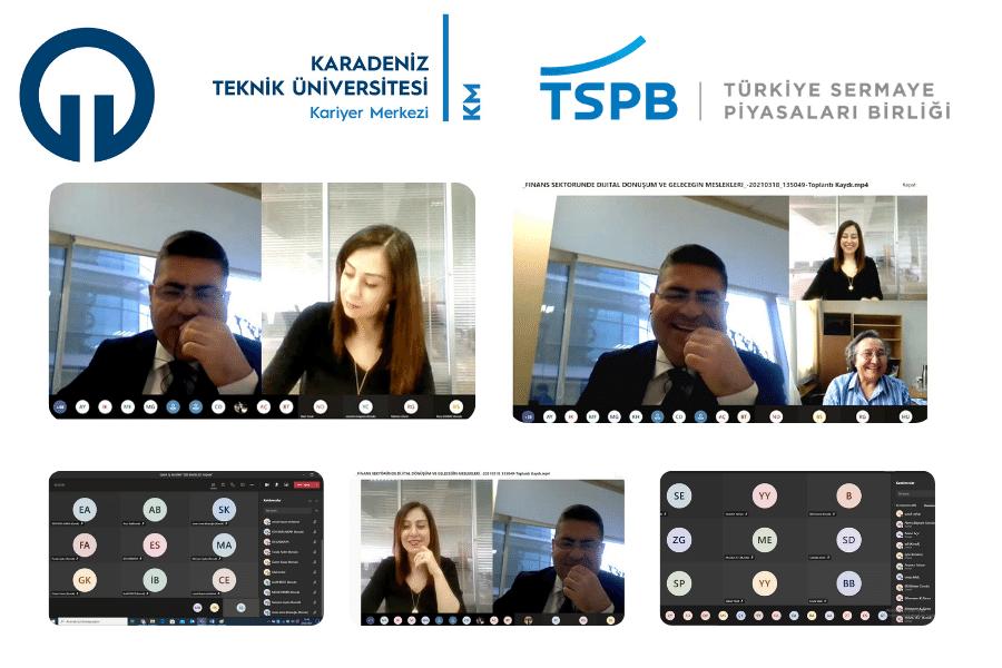 Türkiye Sermaye Piyasalar Birliği ile KTÜ Kariyer Merkezi tarafından düzenlenen “Finans Sektöründe Dijital Dönüşüm ve Geleceğin Meslekleri” semineri 18 Mart 2021 tarihinde, Kariyer Merkezi Koordinatör Yrd. Öğr. Gör. Setenay ŞEVİK'in moderatörlüğünde, TSPB Eğitim Müdürü Dr. Gökhan BÜYÜKŞENGÜR sunumuyla online olarak gerçekleştirildi.