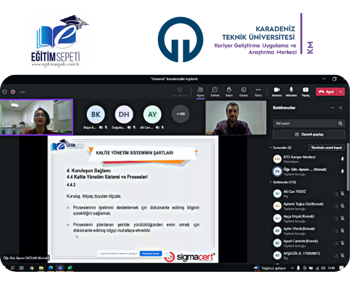 KTÜ Kariyer Geliştirme Uygulama ve Araştırma Merkezi (KM) ile Sigmacert Eğitim Sepeti’nin düzenlediği “ISO 9001:2015 Kalite Yönetim Sistemi ” bilgilendirme eğitimi KM Müdür Yrd. Öğr. Gör. Ahmet KÜÇÜK moderatörlüğünde 186 kişinin katılımıyla 20 Ekim 2022 tarihinde online olarak gerçekleştirildi.