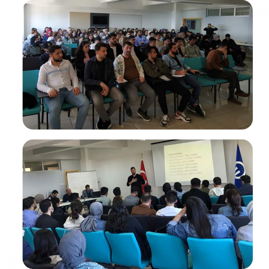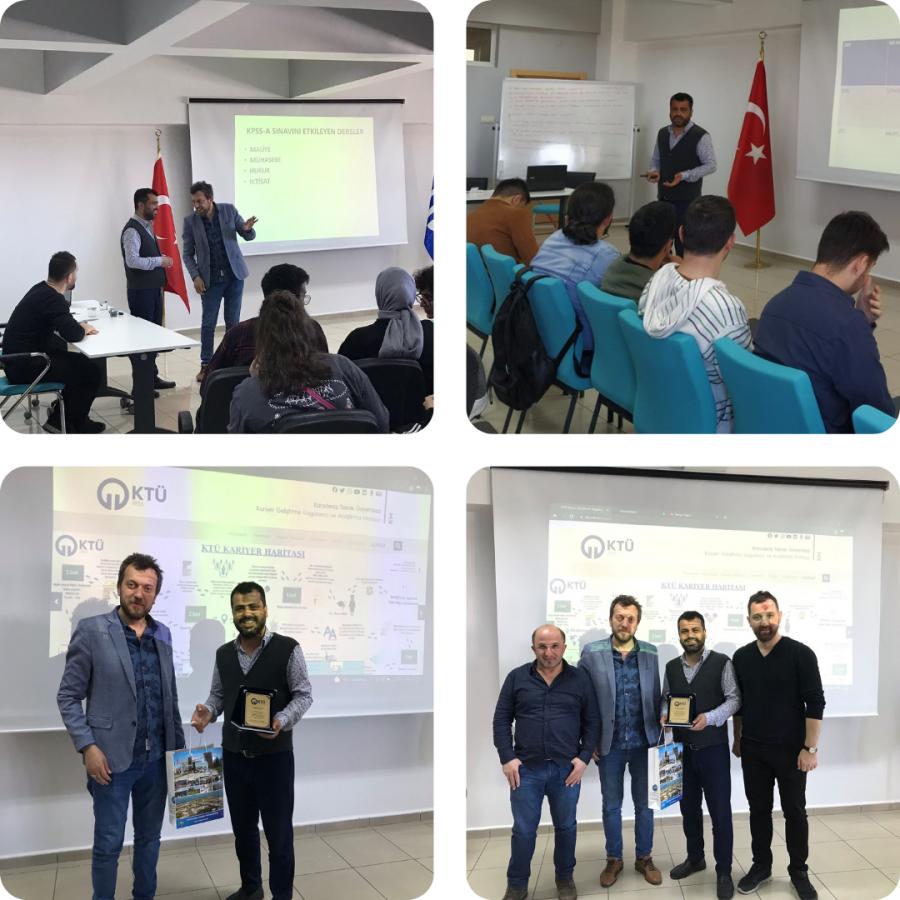Etkinlik KM Müdür Yrd. Öğr. Gör. Ahmet KÜÇÜK ’ün konuşmasıyla başladı. Konuşmasında Ulusal Staj Programı ve Yetenek Kapısı başvurularından bahsetti. Ardından Eğitimci, Yazar ve Editör Mustafa KARADENİZ KPSS sonrası devlet atamalarından bahsetti. Meslek geçiş aşamalarında mülakat süreçlerini ve kurum sınav sorularının dağılımının nasıl olduğunu anlattı. KPSS sonuçları ile sahip olunabilecek meslekler ve KPSS sonuçlarıyla alımın olmadığı kurumların tanımını ve içeriğini anlattı. Trabzon Pegem Akademi Sahibi İsmail Uğur UĞURLU KaHoot uygulaması üzerinden yarışma yaparak kazanan katılımcılara hediyelerini verdi. Etkinlik KM Müdür Yrd. Öğr. Gör. Ahmet KÜÇÜK ‘ün konuşmacımıza plaket ve hediye takdim etmesiyle sonlandırıldı.