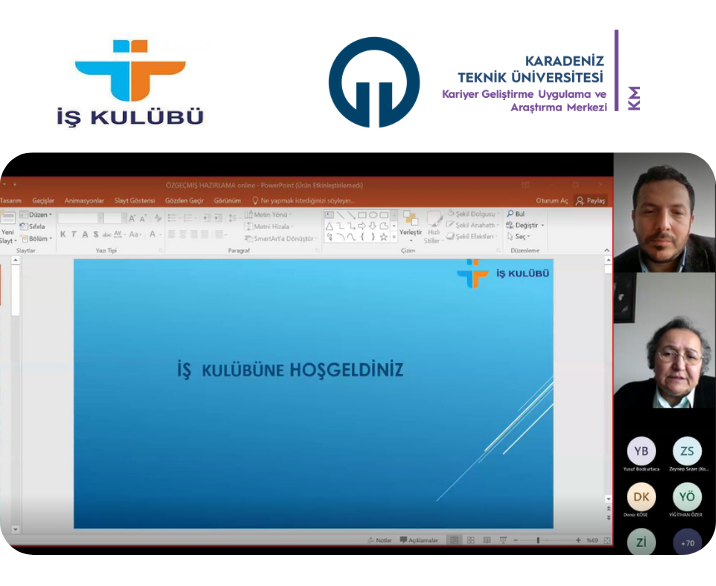 KTÜ Kariyer Geliştirme Uygulama ve Araştırma Merkezi ile İş Kulübü’nün düzenlediği “Kendini Tanıma ve Özgeçmiş Oluşturma” başlıklı etkinlik 30-31 Mart 2023 tarihinde Prof. Dr. Hülya KALAYCIOĞLU moderatörlüğünde online olarak gerçekleştirildi.