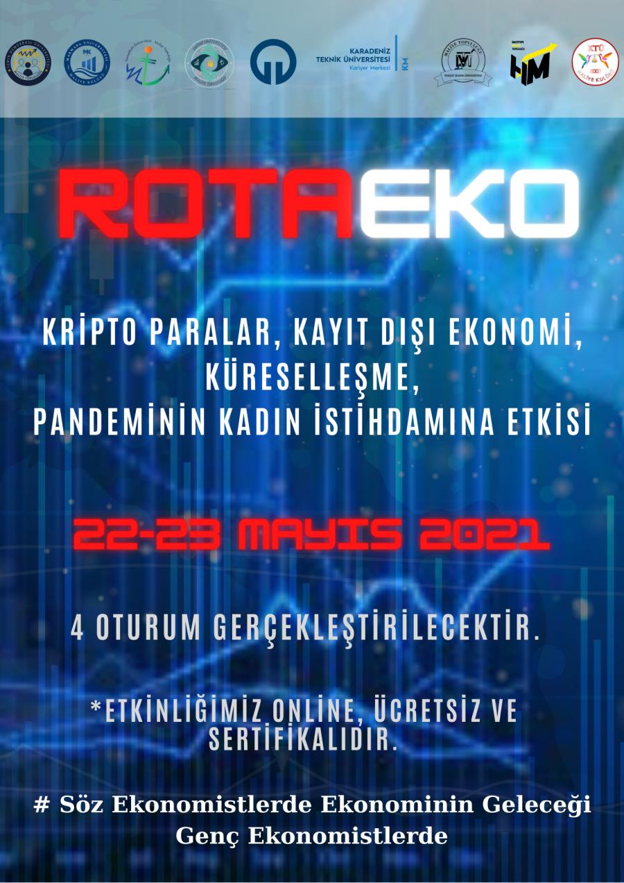 İzmir Demokrasi Üniversitesi, Marmara Üniversitesi, Pamukkale Üniversitesi, Karadeniz Teknik Üniversitesi, İnönü Üniversitesi, Yozgat Bozok Üniversitesi, Hacettepe Üniversitesi Maliye Toplulukları ve KTÜ Kariyer Merkezi işbirliğinde düzenlenen “ROTAEKO” semineri 22-23 Mayıs 2021 tarihinde online olarak gerçekleştirildi. Ebubekir YILMAZ ve İlayda ÇALIŞKAN moderatörlüğünde, TURMOB Denetleme Kurumu Üyesi Metin YALÇIN, Gümüşhane Üniversitesi Akademisyeni Abdulrahman OLGUN, TİM Danışmanlık Kurucu Ortağı Dr. Vedat Güven ve M.Ü. İşletme Fakültesi Ögr. Üyesi M.Ü. Eskar Müdürü Prof. Dr. Fatma AYANOĞLU sunumlarıyla etkinlik iki gün ve 4 oturum şeklinde gerçekleştirildi.