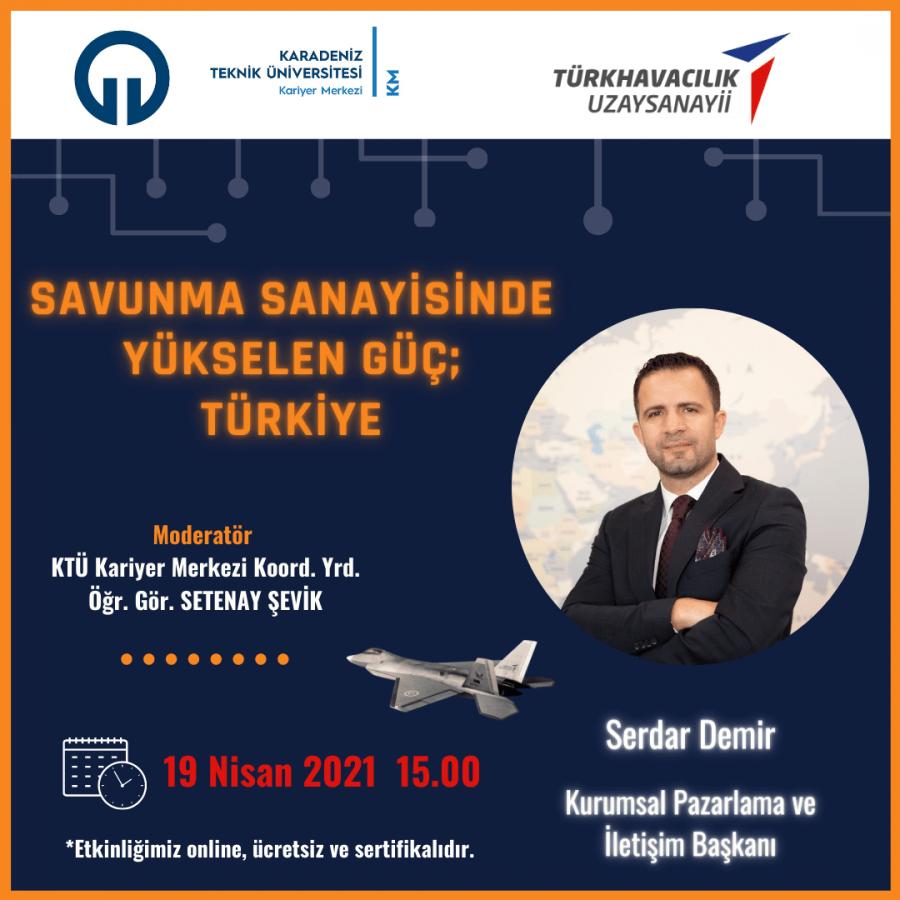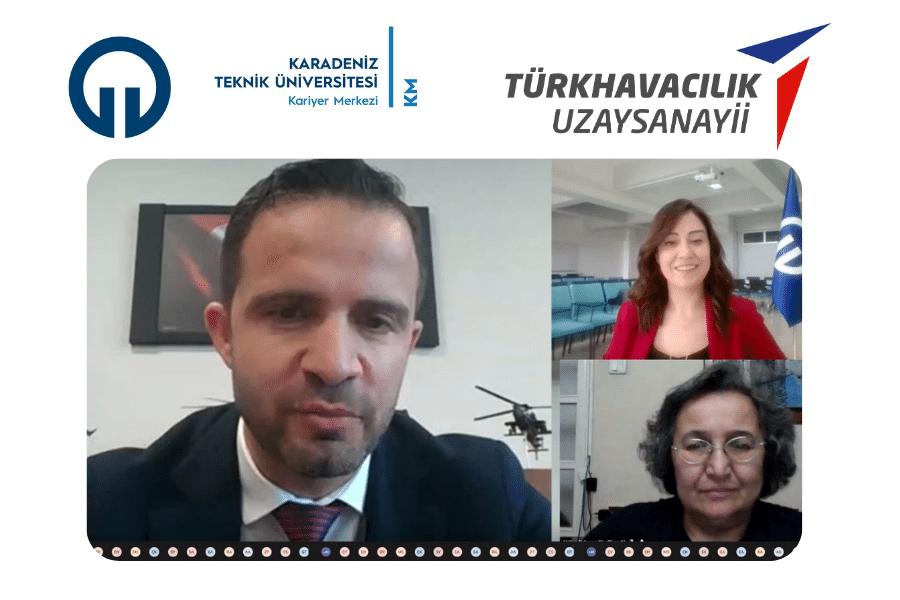 Türk Havacılık Uzay Sanayii ile KTÜ Kariyer Merkezi tarafından düzenlenen “Savunma Sanayisinde Yükselen Güç; TÜRKİYE” semineri 19 Nisan 2021 tarihinde Kariyer Danışmanımız Öğr. Gör. Setenay ŞEVİK’in moderatörlüğünde, Türk Havacılık Uzay Sanayii Kurumsal Pazarlama ve İletişim Başkanı Serdar DEMİR’in sunumuyla online olarak gerçekleştirildi.