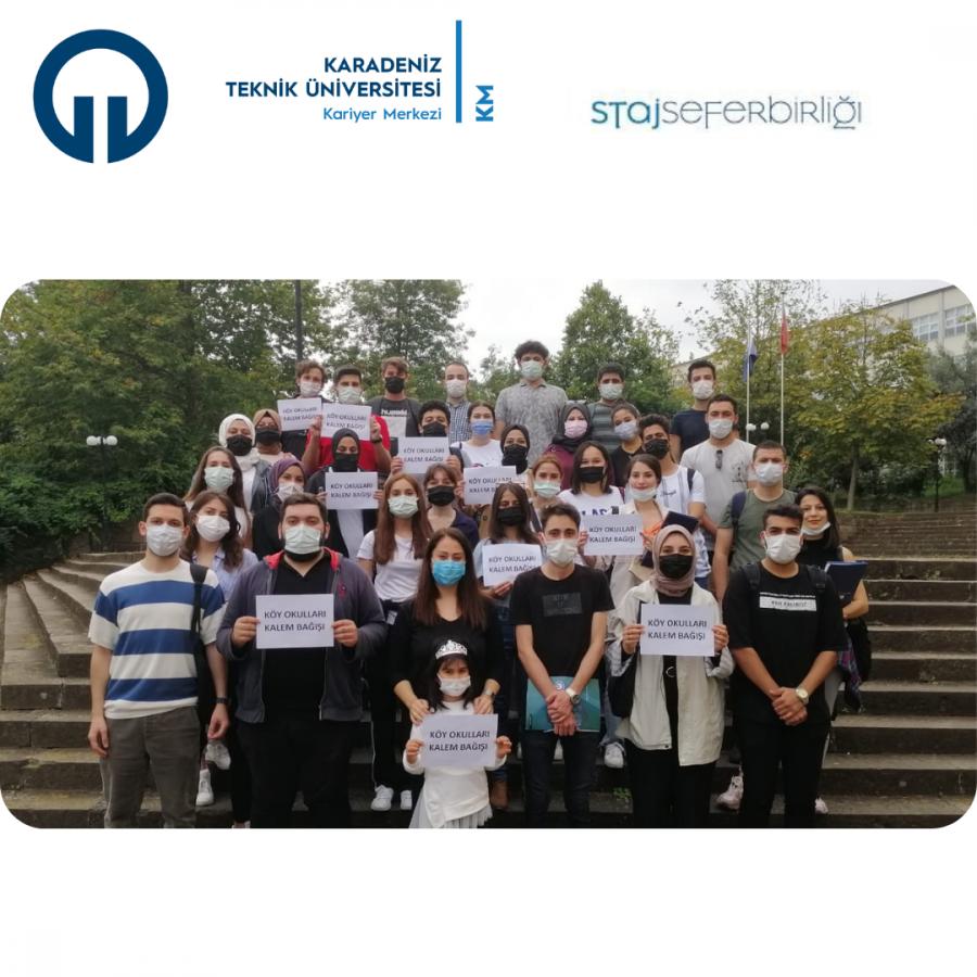 T.C. Cumhurbaşkanlığı İnsan Kaynakları Ofisi “Staj Seferbirliği Programı” kapsamında Karadeniz Teknik Üniversitesi’ne çeşitli üniversitelerden gelerek staj faaliyetlerini yürüten öğrencilerimiz, “Her Kalem Bir Öğrenci” projesi kapsamında 19 Eylül 2021 Pazar günü ALES sınavı çıkışında ÖSYM tarafından adaylara dağıtılan kırtasiye ürünlerini köy okullarına bağışlamak üzere toplama etkinliğine katıldı. Etkinliğe katılan stajyer arkadaşlarımıza teşekkür ederiz.