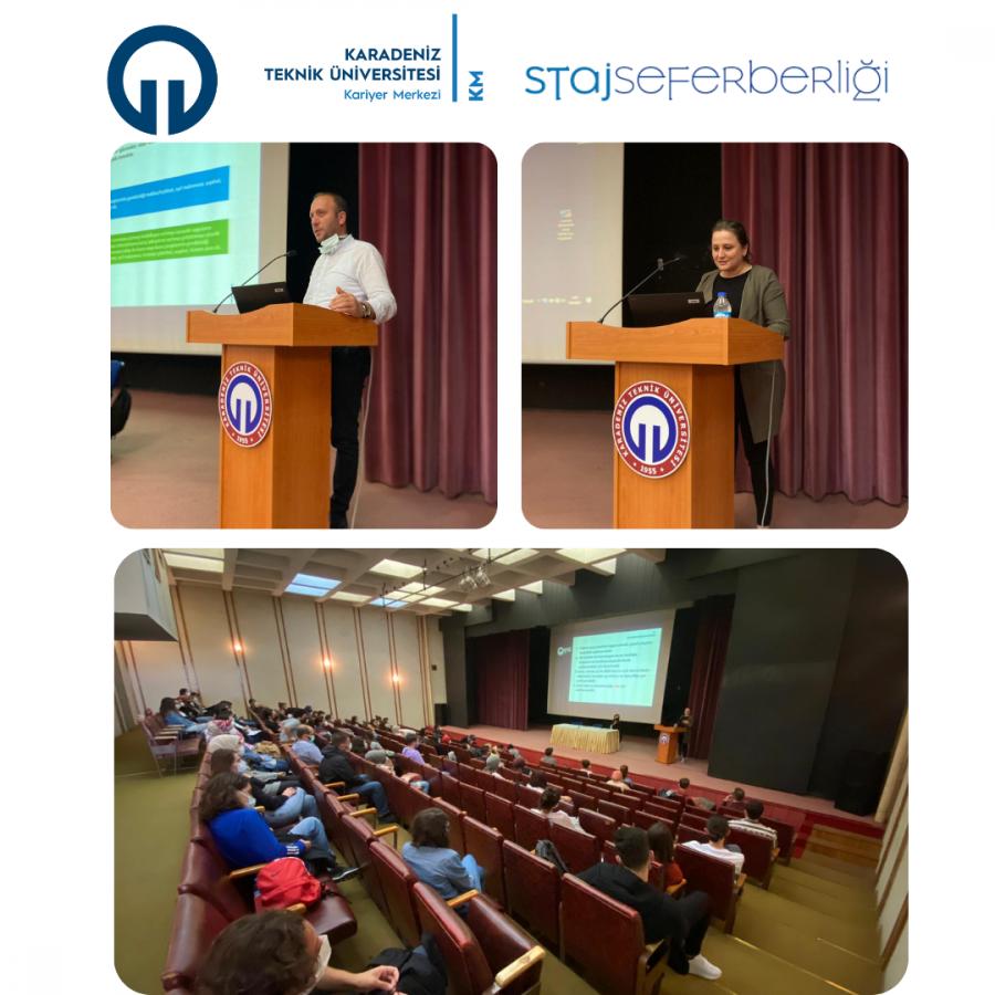 T.C. Cumhurbaşkanlığı İnsan Kaynakları Ofisi “Staj Seferbirliği Programı” kapsamında KTÜ Kariyer Merkezi, KTÜ Teknoloji Transfer Uygulama ve Araştırma Merkezi (TTM) ve KTÜ Rektörlük Yazı İşleri iş birliğiyle düzenlenen “TÜBİTAK Burs Programları” ve “Resmi Yazışma Kuralları” eğitimleri Kariyer Mekezi stajyeri Alipaşa ÖKSÜZ’ün moderatörlüğünde gerçekleştirildi. Kariyer Merkezi Müdür Yard. Öğr. Gör. Setenay ŞEVİK ve Kariyer Merkezi Kariyer Danışmanı Öğr. Gör. Ahmet KÜÇÜK’ün katılımlarıyla 9 Eylül 2021 tarihinde Atatürk Kültür Merkezi’nde sosyal mesafe - hijyen kurallarına uygun bir şekilde gerçekleştirildi.