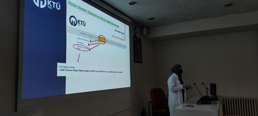 Maçka Meslek Yüksekokulu Müdür yardımcı Prof. Dr. Hacer BAYRAK tarafından Yüksekokulumuz 1. sınıf öğrencilerine 12.01.2022 ve 2. sınıf öğrencilerine 17.01.2022 tarihlerinde, her bölüme ayrı oturumlar halinde Staj Yönetim Sistemi hakkında bilgilendirme sunumları yapıldı.