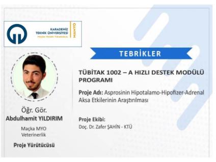Maçka Meslek Yüksekokulu Veterinerlik Bölümü Öğretim Görevlisi Abdulhamit YILDIRIMın "Asprosinin Hipotalamo-Hipofizer-Adrenal Aksa Etkilerinin Araştırılması" başlıklı projesi