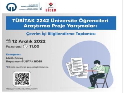TÜBİTAK BİDEB 2242 Üniversite Öğrencileri Araştırma Proje Yarışmaları Bilgilendirme Toplantısı 12 Aralık 2022 Pazartesi Günü Saat: 11.00de gerçekleştirilecektir.