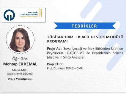 Yüksekokulumuz Akademik Personellerinden Öğr. Gör. Mehtap ER KEMAL'e TÜBİTAK tarafından Proje desteği verilmiştir.