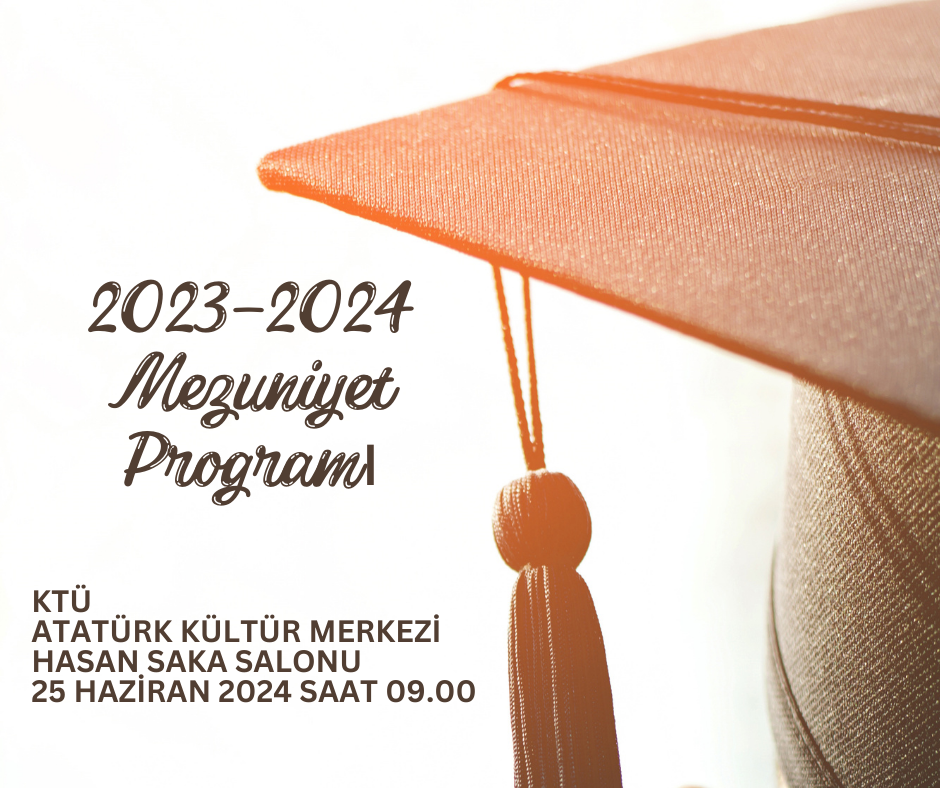 2023-2024 Eğitim-Öğretim yılı Mezuniyet Törenimiz 25 Haziran 2024 Salı günü saat 09.00'da KTÜ Atatürk Kültür Merkezi, Hasan Saka Salonu'nda düzenlecektir.