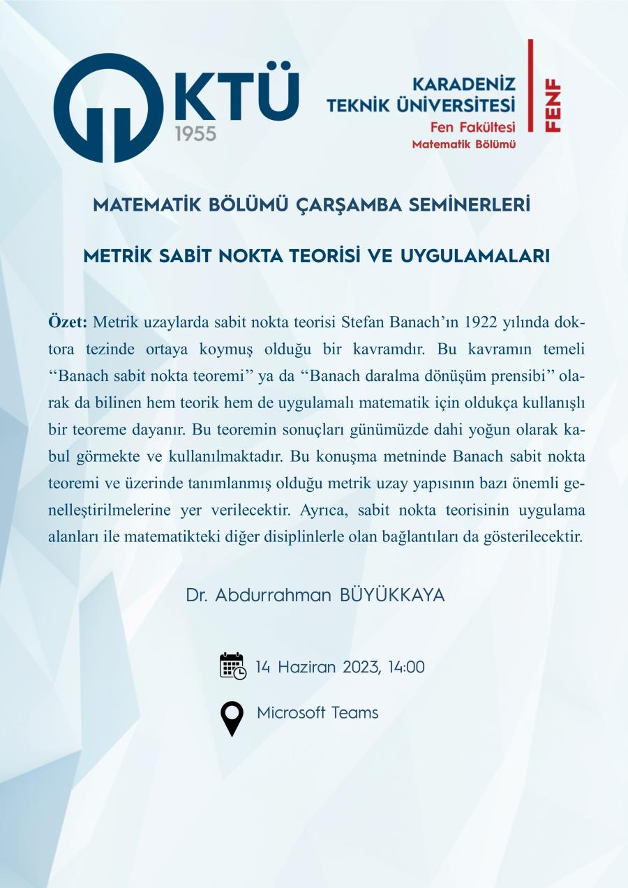 Matematik Bölümü Çarşamba Seminerleri: Metrik Sabit Nokta Teorisi ve Uygulamaları