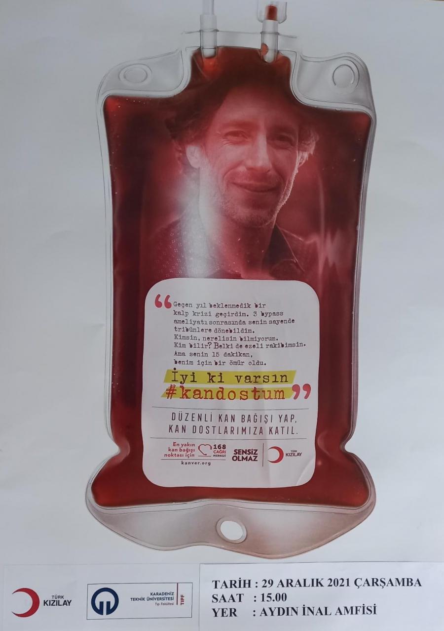 Sayın akademisyenlerimiz ve sevgili öğrencilerimiz 29 Aralık 2021 tarihinde saat: 15.00’te, Fakültemiz Aydın İnal Amfisinde düzenlenecek olan, Trabzon Kızılay Şubesi personelinden Dr. Dila BARAN’ın, katılacağı kan bağışı ile ilgili farkındalık konferansına davetlisiniz.