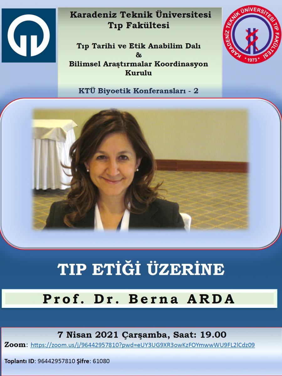 Prof. Dr. Berna ARDA'nın vereceği konferans 07 Nisan 2021, Çarşamba günü saat 19.00'da çevrimiçi (online) olarak gerçekleştirilecektir.