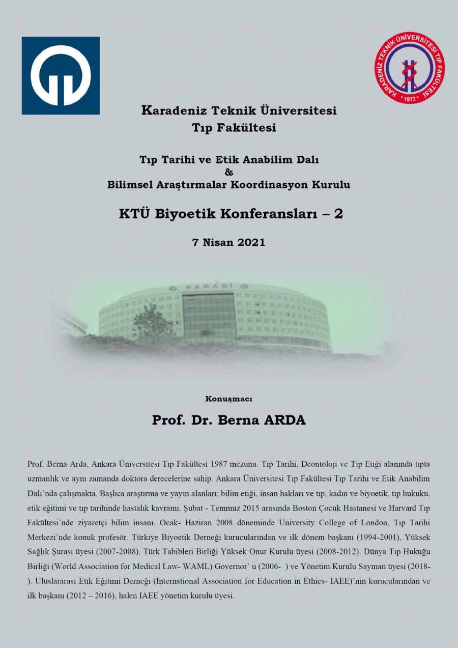 Üniversitemiz Tıp Fakültesi Tıp Tarihi ve Etik Anabilim Dalı ve Bilimsel Araştırmalar Koordinasyon Kurulu tarafından organize edilen KTÜ Biyoetik Konferansları serisi, Ankara Üniversitesi Tıp Fakültesi Öğretim Üyelerinden Prof. Dr. Berna ARDA'nın "Tıp Etiği Üzerine" başlıklı konuşması ile Nisan ayında devam ediyor.
