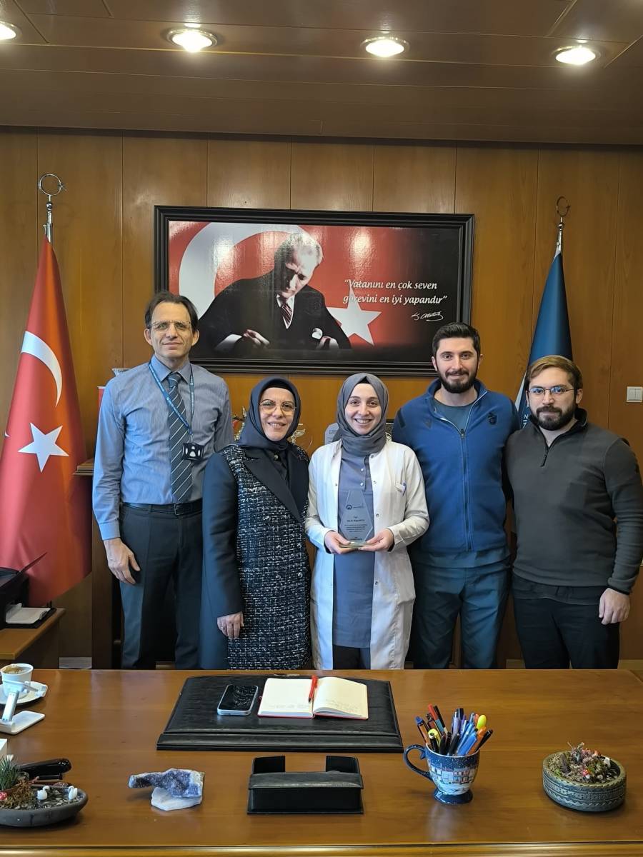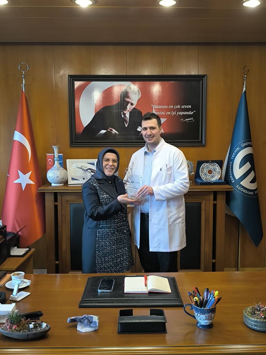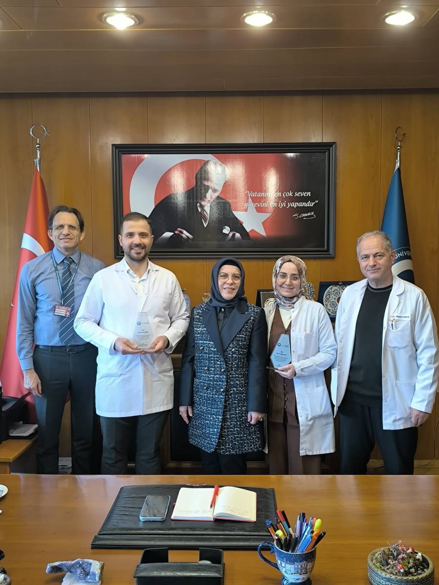 Fakültemizde uzmanlık eğitimlerini tamamlayan Göz Hastalıkları Anabilim Dalından Uzm. Dr. Çiğdem ATEŞ ile Uzm. Dr. Burak UZUN, Kulak Burun Boğaz Anabilim Dalından Uzm. Dr. Müjgan MUTLU, Üroloji Anabilim Dalından Uzm. Dr. Serdar CİNCOROP, Beyin ve Sinir Cerrahisi Anabilim Dalından Uzm. Dr. Yağmur KURAK' a Dekanımız Prof. Dr. Sevdegül AYDIN MUNGAN tarafından plaketleri takdim edildi.