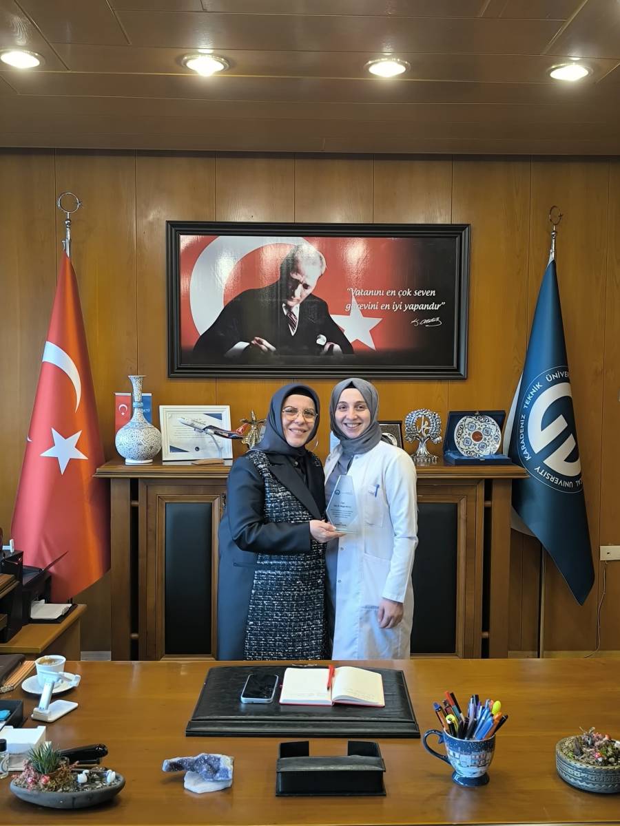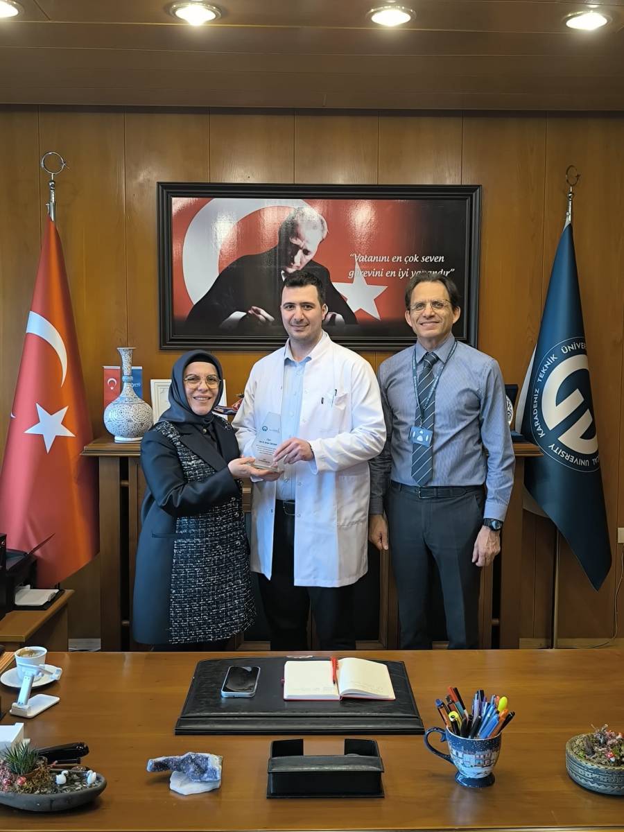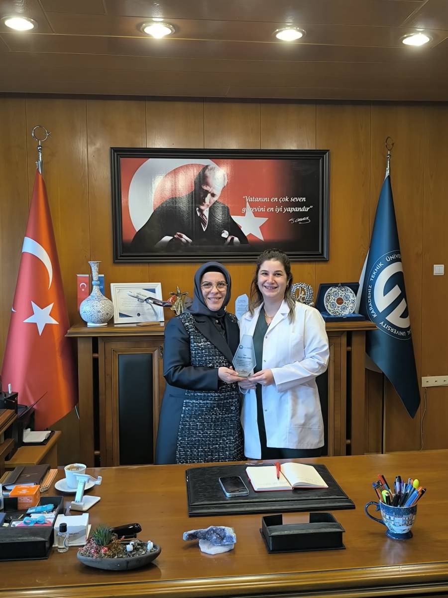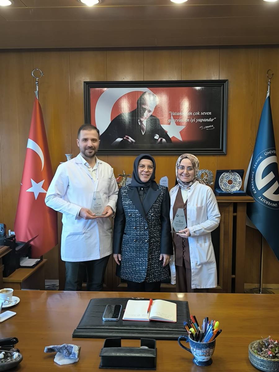 Fakültemizde uzmanlık eğitimlerini tamamlayan Göz Hastalıkları Anabilim Dalından Uzm. Dr. Çiğdem ATEŞ ile Uzm. Dr. Burak UZUN, Kulak Burun Boğaz Anabilim Dalından Uzm. Dr. Müjgan MUTLU, Üroloji Anabilim Dalından Uzm. Dr. Serdar CİNCOROP, Beyin ve Sinir Cerrahisi Anabilim Dalından Uzm. Dr. Yağmur KURAK' a Dekanımız Prof. Dr. Sevdegül AYDIN MUNGAN tarafından plaketleri takdim edildi.