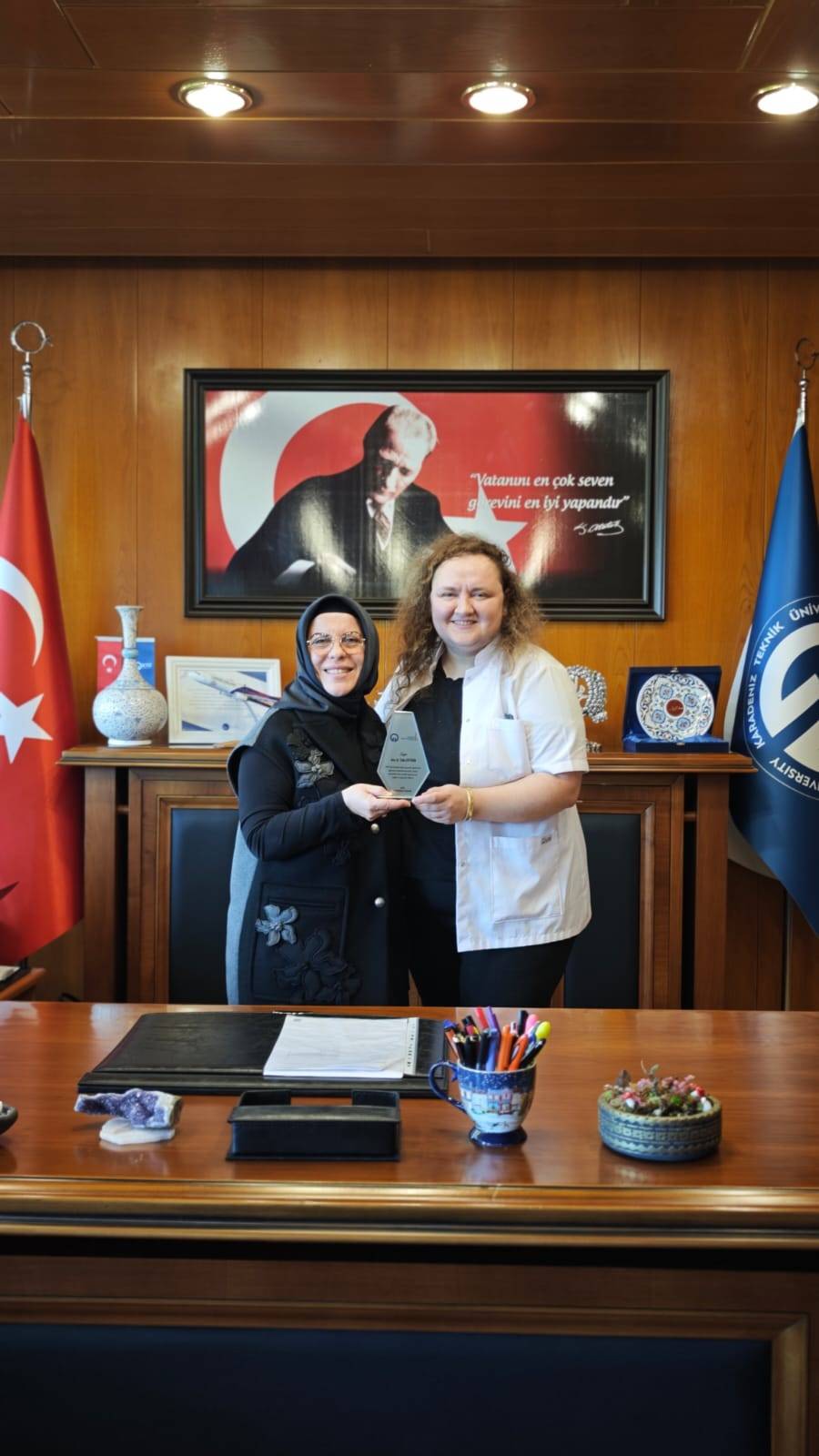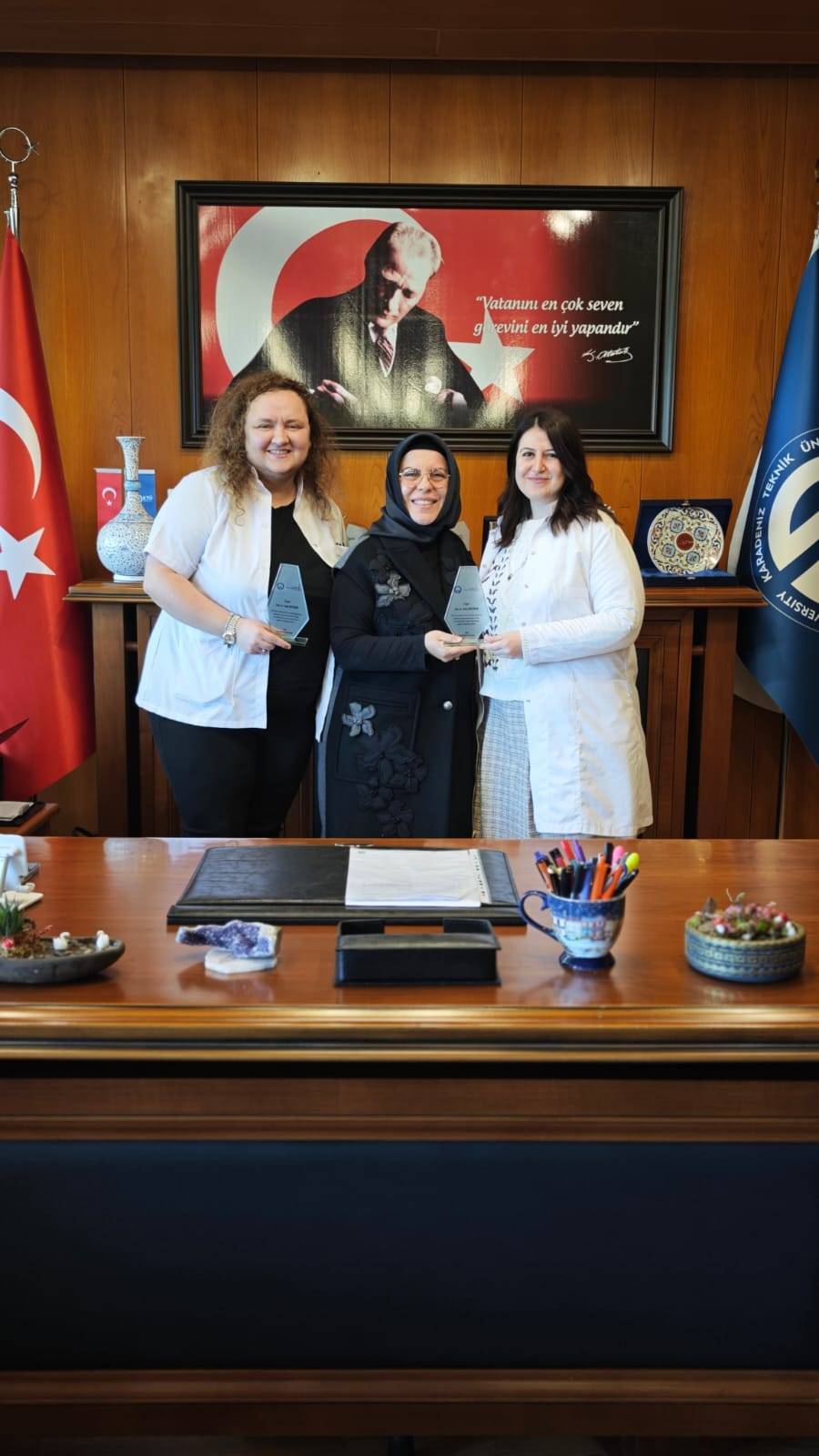 Fakültemizde uzmanlık eğitimlerini tamamlayan Mikrobiyoloji Anabilim Dalından Uzm. Dr. Merve ÖZDERYA ve İç Hastalıkları Anabilim Dalından Uzm. Dr. Seda AKDUMAN ile Uzm. Dr. Tuba ERTEKİN'e Dekanımız Prof. Dr. Sevdegül AYDIN MUNGAN tarafından plaketleri takdim edildi.