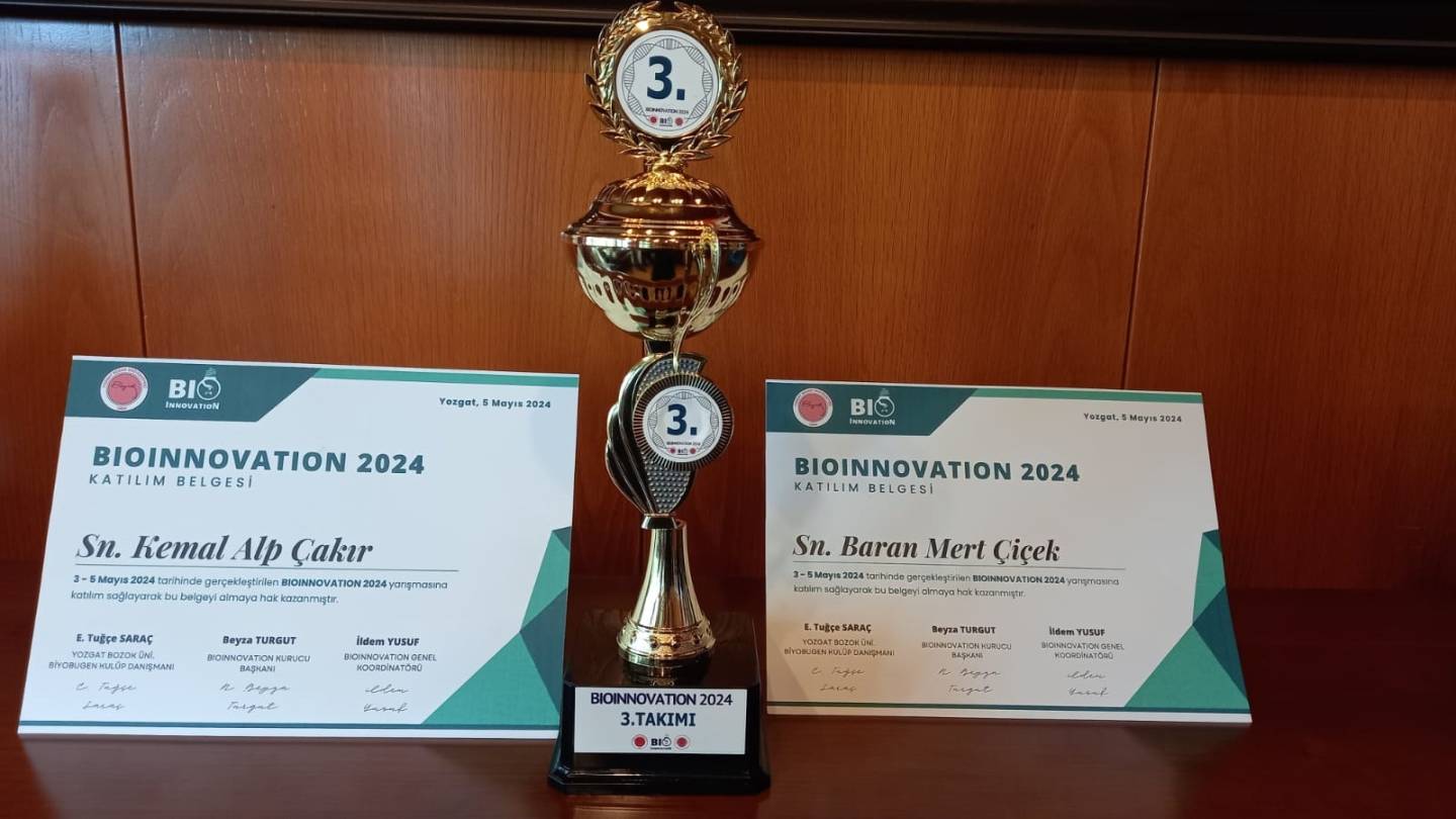Yozgat Bozok Üniversitesi sahipliğinde düzenlenen Bioinovation 2024 yarışmasında “Yaşlı Hastalar İçin Akıllı İlaç Takip Sistemi ve Akıllı İlaç Bardağı” projesi ile 3.lük alan Gizimus takımını kutluyoruz.