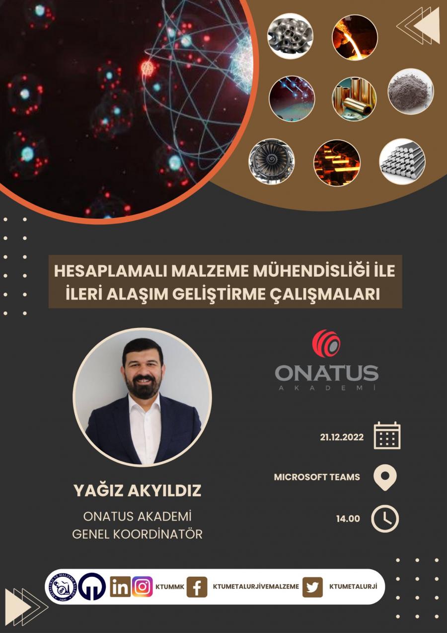 Metalurji ve Malzeme Mühendisliği Bölümü ve Metalurji ve Malzeme Kulübü olarak ONATUS AKADEMİ ile birlikte düzenlediğimiz “Hesaplamalı Malzeme Mühendisliği ile İleri Alaşım Geliştirme Çalışmaları” konulu etkinliğimizde Onatus Akademi Genel Koordinatörü Sn. Yağız Akyıldız hocamız 21 Aralık Çarşamba günü saat 14.00’da Microsoft Teams platformunda bizlerle olacak.
