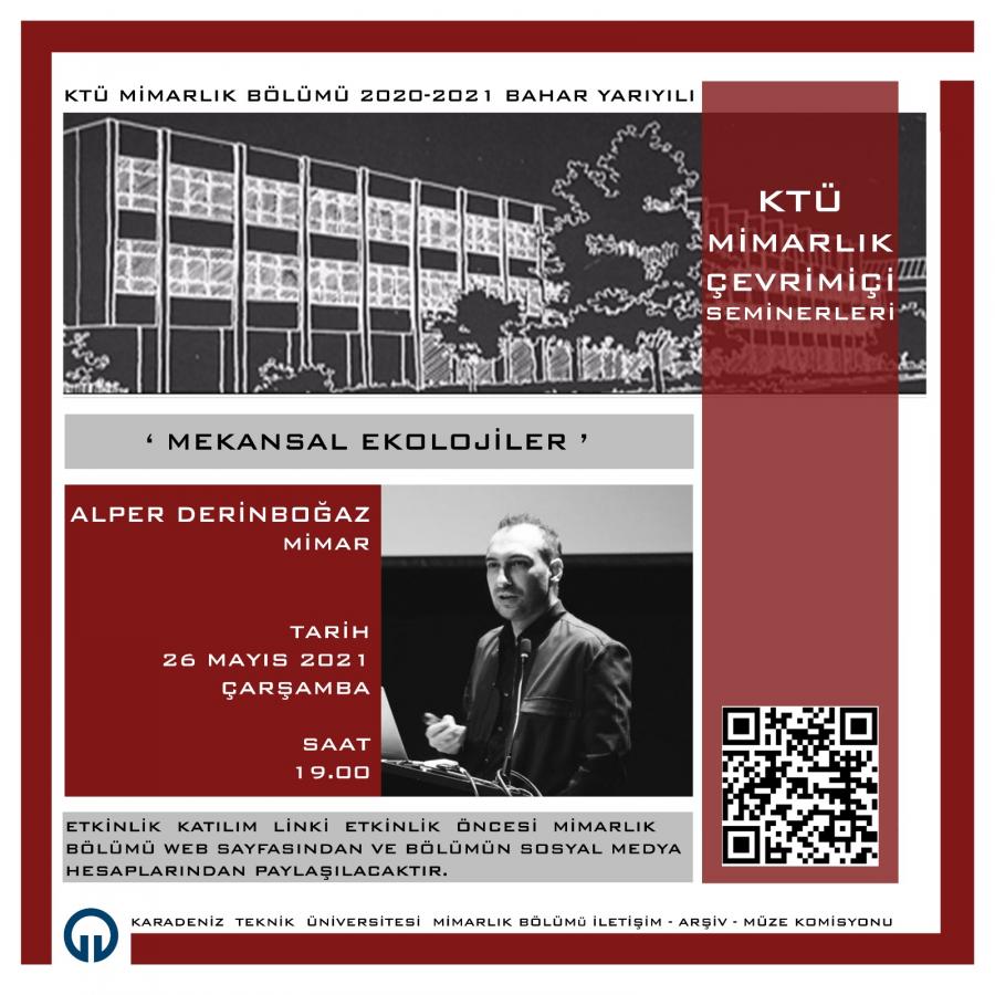 Karadeniz Teknik Üniversitesi Mimarlık Bölümü İletişim-Arşiv-Müze Komisyonu tarafından düzenlenen Mimarlık Bölümü Çarşamba Seminerleri kapsamında 26 Mayıs 2021 Çarşamba günü saat 19:00’da Mimar Alper DERİNBOĞAZ "Mekânsal Ekolojiler" konulu semineri ile bizlerle buluşacaklardır. Akademik personelimize ve öğrencilerimize önemle duyurulur.