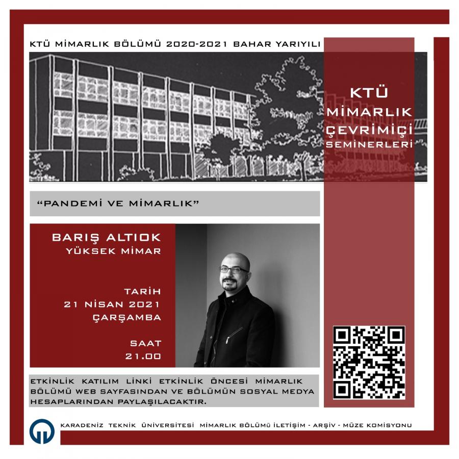 Karadeniz Teknik Üniversitesi Mimarlık Bölümü İletişim-Arşiv-Müze Komisyonu tarafından düzenlenen Mimarlık Bölümü Çarşamba Seminerleri kapsamında 21 Nisan 2021 Çarşamba günü saat 21.00’da Yüksek Mimar Barış ALTIOK, "Pandemi ve Mimarlık" konulu semineri ile bizlerle buluşacaklardır. Akademik personelimize ve öğrencilerimize önemle duyurulur.