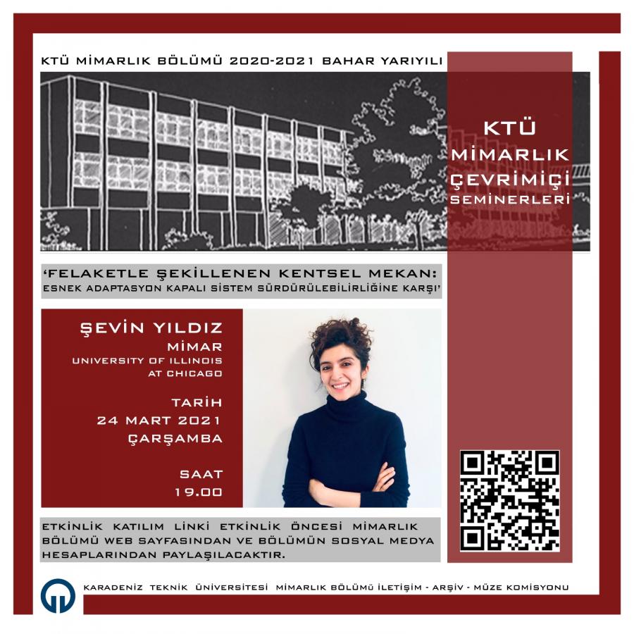 Karadeniz Teknik Üniversitesi Mimarlık Bölümü İletişim-Arşiv-Müze Komisyonu tarafından düzenlenen Mimarlık Bölümü Çevrimiçi Seminerleri kapsamında 24 Mart 2021 Çarşamba günü saat 19.00’da Mimar Şevin YILDIZ ‘Felaketle Şekillenen Kentsel Mekan: Esnek Adaptasyon Kapalı Sistem Sürdürülebilirliğine Karşı’ konulu semineri ile bizlerle buluşacaklardır. Akademik personelimize ve öğrencilerimize önemle duyurulur.