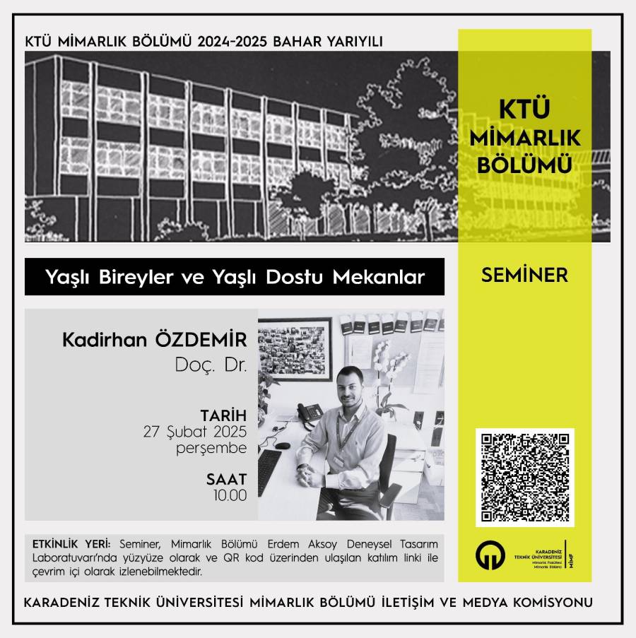 Karadeniz Teknik Üniversitesi Mimarlık Bölümü İletişim ve Medya Komisyonu tarafından düzenlenen Mimarlık Bölümü Seminerleri kapsamında 27 Şubat 2025 Perşembe günü saat 10.00’da Doç. Dr. Kadirhan Özdemir " Yaşlı Bireyler ve Yaşlı Dostu Mekanlar " konulu semineri ile yüz yüze olarak Erdem Aksoy Deneysel Tasarım Laboratuvarı’nda bizlerle buluşacaklardır. Tüm akademik personelimize ve öğrencilerimize önemle duyurulur.