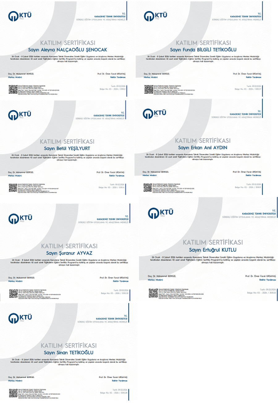Birim kalite komisyonu kararları doğrultusunda eğitim yetkinnliğini ve akademik kaliteyi artırmak amacıyla bölüm öğretim elemanlarımız ve lisansüstü öğrencilerimiz 'Eğiticilerin Eğitimi' sertifikası aldı. Bölümümüz araştırma görevlilerimizden Erkan Anıl Aydın, Şuranur Ayvaz, Funda Bilgili Tetikoğlu, Ertuğrul Kutlu, Aleyna Nalçaoğlu Şenocak, Betül Yeşilyurt ve doktora öğrencimiz Sinan Tetikoğlu KTÜ Öğretme ve Öğrenme Merkezi (Ö-MER) ile KTÜ Sürekli Eğitim Uygulama ve Araştırma Merkezi (SEM) tarafından yürütülen 'Eğiticilerin Eğitimi Sertifika Programı'nı başarıyla tamamlayarak eğitim alanında uzmanlaşmaya bir adım daha yaklaşmıştır. Eğitim 26-30 Ocak 2026 tarihleri arasında çevrimiçi olarak toplam 45 saatlik canlı dersler şeklinde gerçekleştirilmiştir. Katılımcılar, öğretim tasarımı, ölçme ve değerlendirme, teknoloji entegrasyonu ve yapay zekâ destekli eğitim uygulamaları gibi kapsamlı eğitim modüllerinden faydalanmıştır. Program sonunda yapılan sınavlar sonucunda başarılı olan araştırma görevlilerimiz e-Devlet onaylı başarı sertifikası almaya hak kazanarak pedagojik ve eğitici yetkinliklerini belgelendirmiştir.