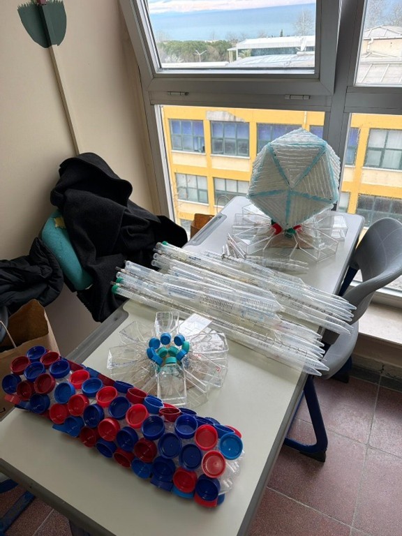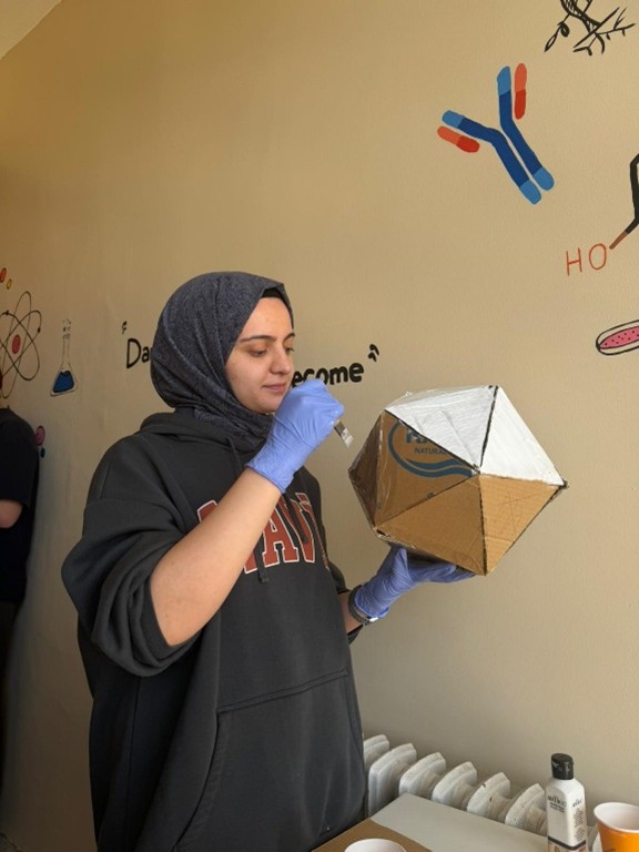 Atölye etkinliğinde öğrencilerimiz, kullanılmayan plastik pipet uçları, tüpler ve benzeri laboratuvar atıklarını değerlendirerek bakteriyofaj maketi oluşturdu. Hem bilimsel hem de çevresel farkındalık kazandırmayı amaçlayan etkinlikte, öğrenciler laboratuvar atıklarının geri dönüşüm ve yeniden kullanım potansiyeline dikkat çekti.