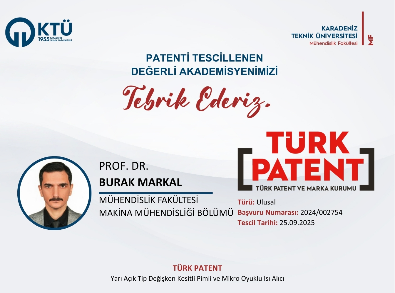 Fakültemiz Makina Mühendisliği öğretim üyesi Prof. Dr. Burak MARKAL'ın "Yarı Açık Tip Değişken Kesitli Pimli ve Mikro Oyuklu Isı Alıcı" isimli patent başvurusu tescillenmiştir.