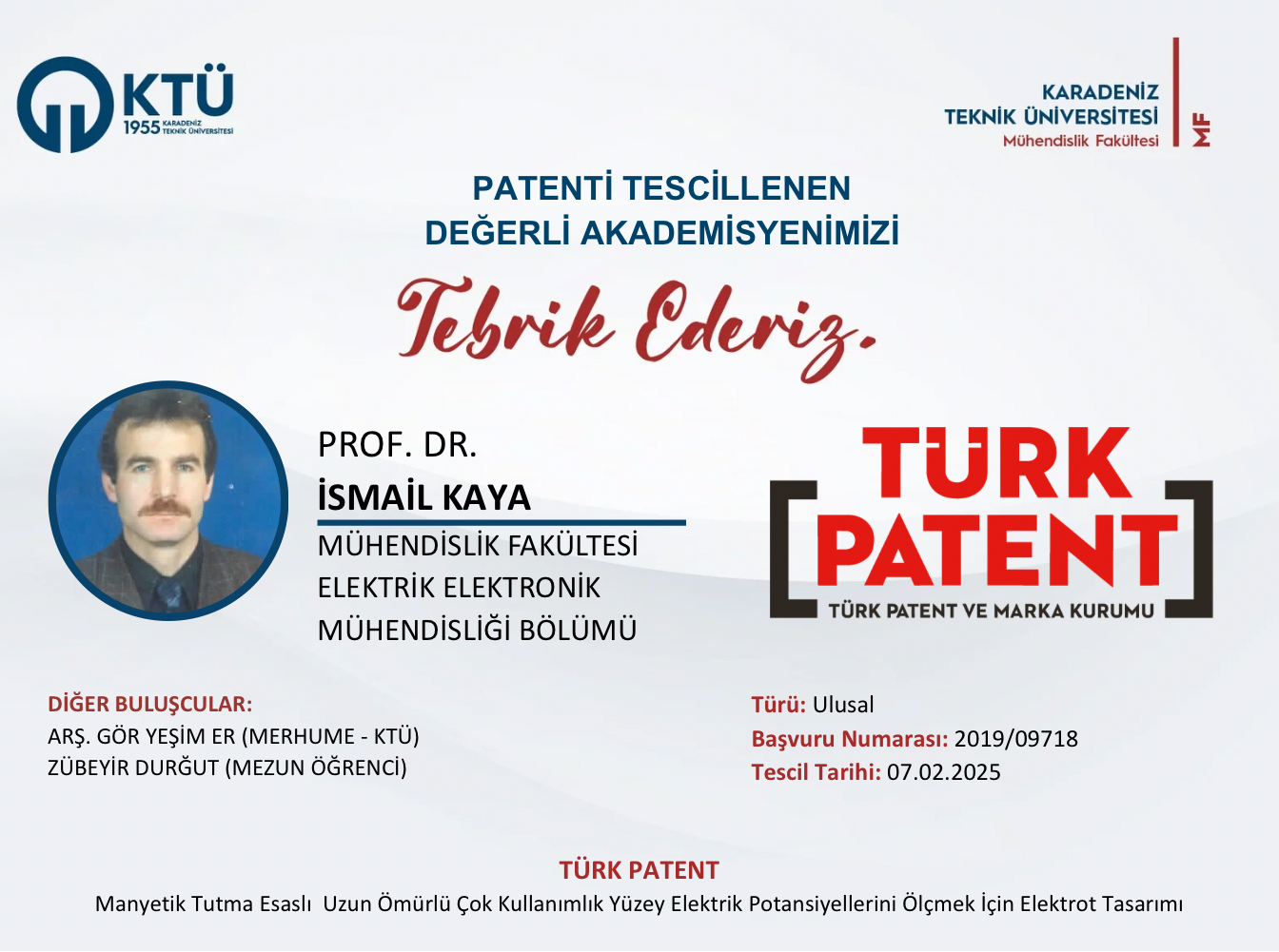 Fakültemiz Elektrik Elektronik Mühendisliği öğretim üyesi Prof. Dr. İsmail KAYA'nın "Manyetik Tutma Esaslı Uzun Ömürlü Çok Kullanımlık Yüzey Elektrik Potansiyellerini Ölçmek İçin Elektrot Tasarımı" isimli patent başvurusu tescillenmiştir.