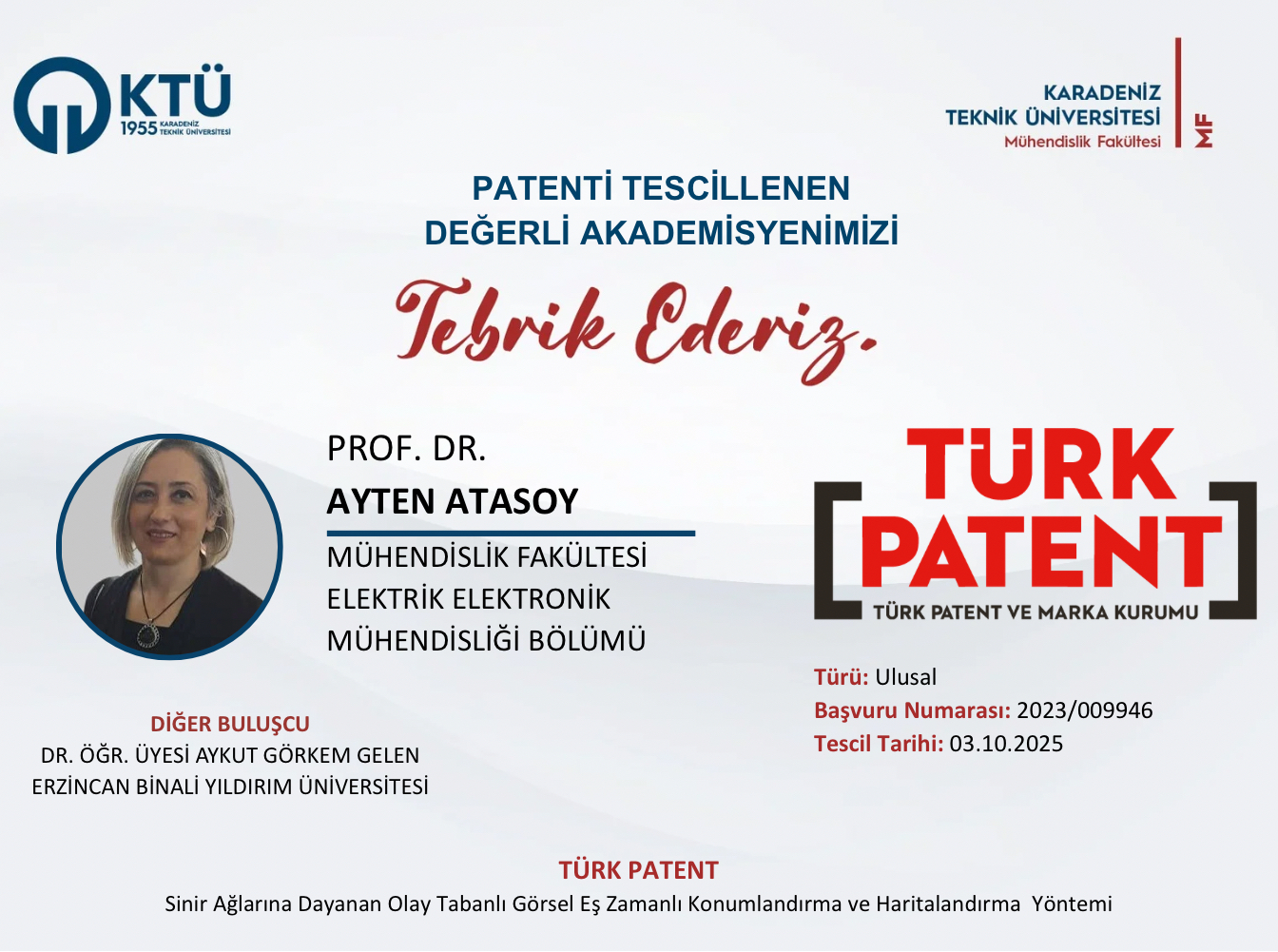 Fakültemiz Elektrik Elektronik Mühendisliği öğretim üyesi Prof. Dr. Ayten ATASOY'un "Sinir Ağlarına Dayanan Olay Tabanlı Görsel Eş Zamanlı Konumlandırma ve Haritalandırma Yöntemi" isimli patent başvurusu tescillenmiştir.