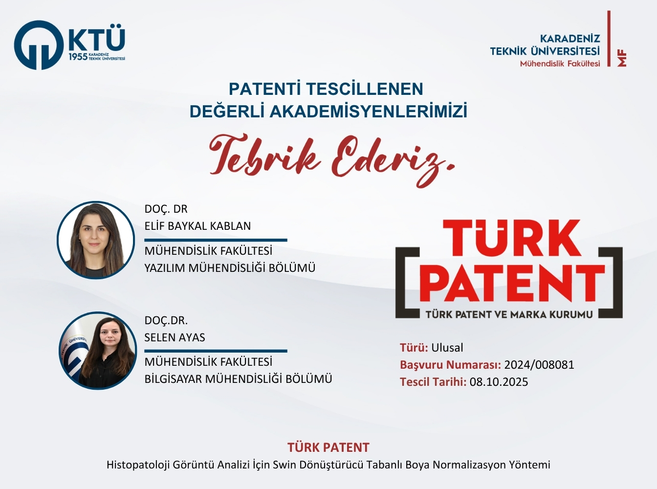 Fakültemiz Yazılım Mühendisliği öğretim üyesi Doç. Dr. Elif BAYKAL KABLAN ve Bilgisayar Mühendisliği öğretim üyesi Doç. Dr. Selen AYAS'ın "Histopatoloji Görüntü Analizi İçin Swin Dönüştürücü Tabanlı Boya Normalizasyon Yöntemi" isimli patent başvurusu tescillenmiştir.