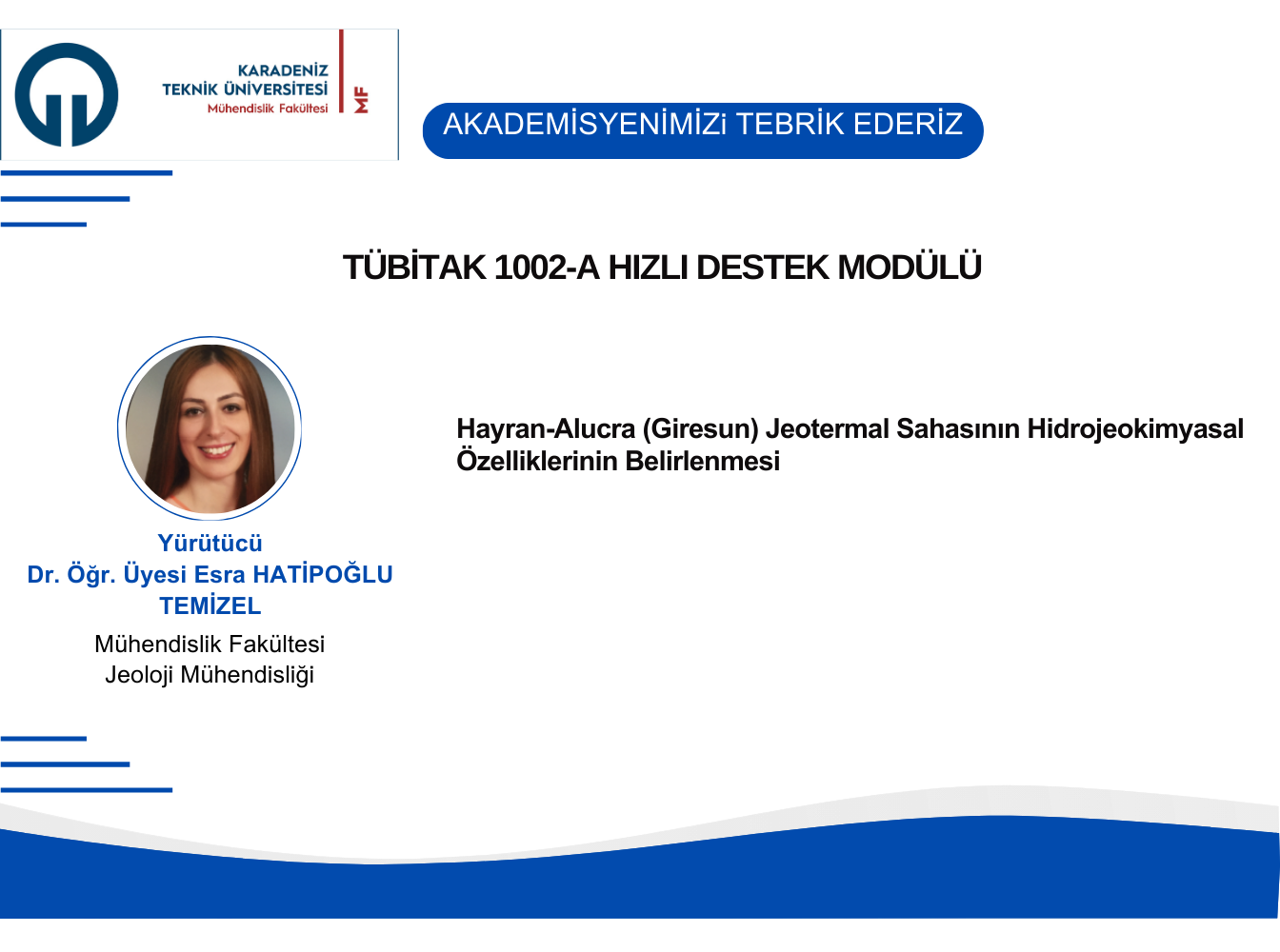 Üniversitemiz Mühendislik Fakültesi Jeoloji Mühendisliği Bölümü Öğretim Üyesi Dr. Öğr. Üyesi Esra HATİPOĞLU TEMİZEL'in “Hayran-Alucra (Giresun) Jeotermal Sahasının Hidrojeokimyasal Özelliklerinin Belirlenmesi” başlıklı projesi, “TÜBİTAK 1002-A Hızlı Destek Modülü” kapsamında desteklenmiştir.