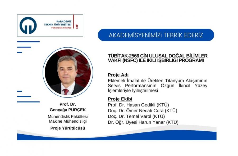 Üniversitemiz Mühendislik Fakültesi Makine Mühendisliği Bölümü Öğretim Üyesi Prof. Dr. Gençağa PÜRÇEK’in "Eklemeli İmalat ile Üretilen Titanyum Alaşımının Servis Performansının Özgün İkincil Yüzey İşlemleriyle İyileştirilmesi" başlıklı projesi “TÜBİTAK-2566 Çin Ulusal Doğal Bilimler Vakfı (NSFC) ile İkili İş Birliği Programı” kapsamında desteklenmiştir. Proje Yürütücüsü ve Araştırmacıları tebrik eder, başarılarının devamını dileriz.