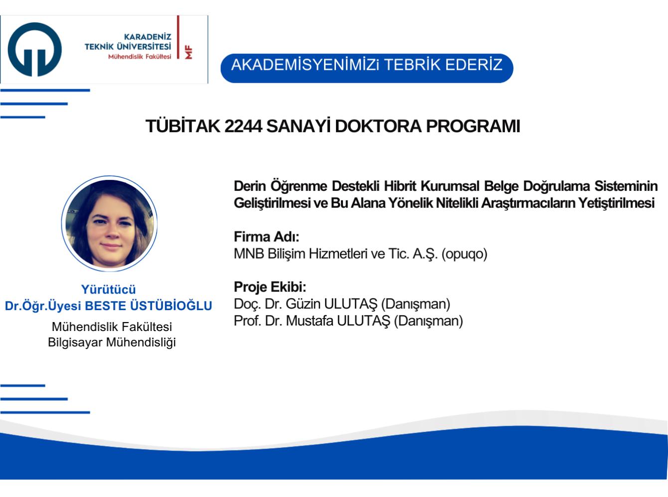 Üniversitemiz Mühendislik Fakültesi Bilgisayar Mühendisliği Bölümü öğretim üyelerinden Dr. Öğr. Üyesi Beste ÜSTÜBİOĞLU 'nun  "Derin Öğrenme Destekli Hibrit Kurumsal Belge Doğrulama Sisteminin Geliştirilmesi ve Bu Alana Yönelik Nitelikli Araştırmacıların Yetiştirilmesi" başlıklı projesi TÜBİTAK 2244 Sanayi Doktora Programı tarafından desteklenmiştir. Akademisyenimizi ve proje ekibini tebrik eder, başarılarının devamını dileriz.