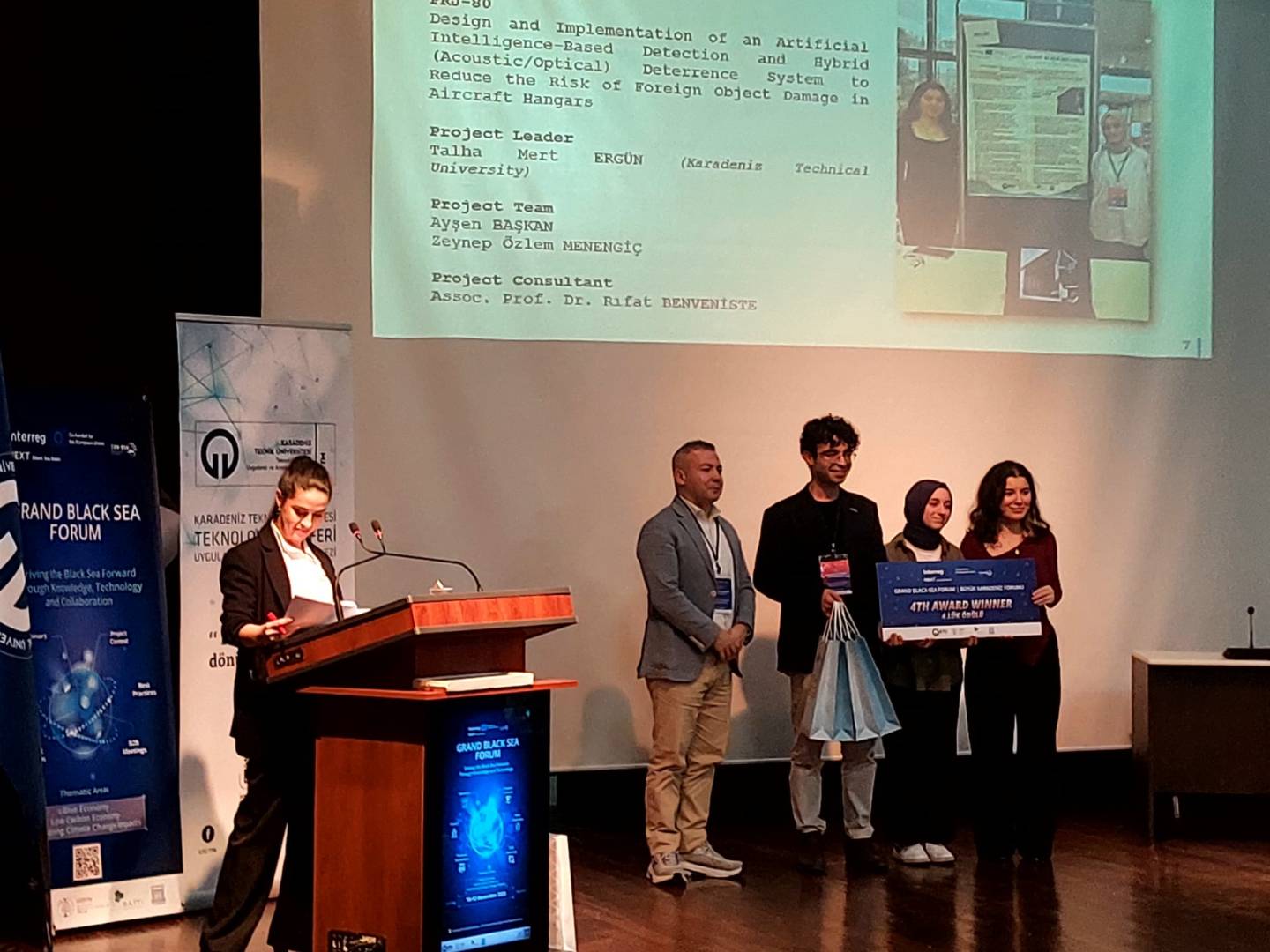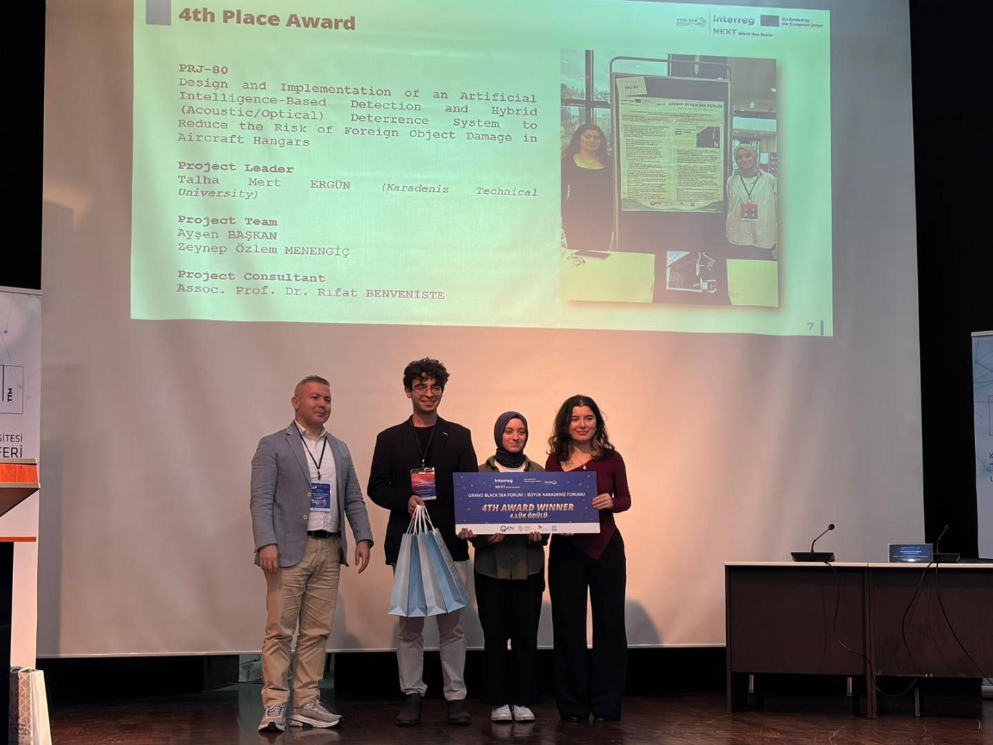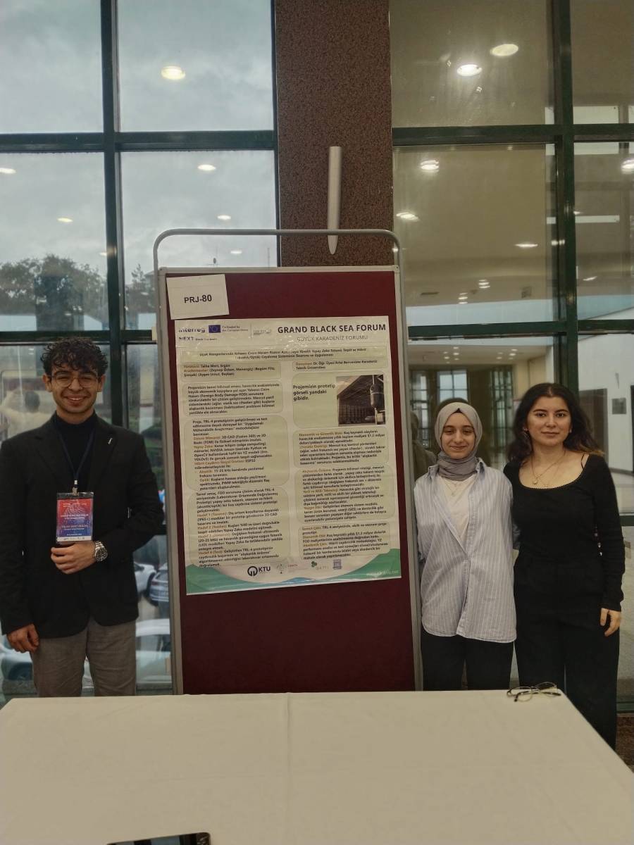 Çeşitli etkinliklerin ardından “Uluslararası Proje Yarışması” yapıldı. Yarışmada Of Teknoloji Fakültesi öğrencilerinin projesi “Uçak Hangarlarında Yabancı Cisim Hasarı Riskini Azaltmaya Yönelik Yapay Zeka Tabanlı Tespit ve Hibrit (Akustik/Optik) Caydırma Sisteminin Tasarımı ve Uygulaması” ulusal ve uluslararası olmak üzere toplam 84 proje arasından 4.’lük elde etti. Proje, havacılık güvenliğini artırmaya yönelik yenilikçi bir çözüm ortaya koydu. Gelen olumlu geri bildirimlerin ardından ekip, çalışmayı girişimcilik aşamasına taşıyarak sürdürülebilir ve sektörel bir ürüne dönüştürmeyi hedefliyor. Projede Fakültemiz Elektronik ve Haberleşme Mühendisliği 3.sınıf öğrencisi Talha Mert Ergün, 2.sınıf öğrencisi Ayşen Başkan, 1.sınıf öğrencisi Zeynep Özlem Menengiç yer aldı. Proje danışmanlığını Dr. Öğr. Üyesi Rıfat Benveniste yürüttü.