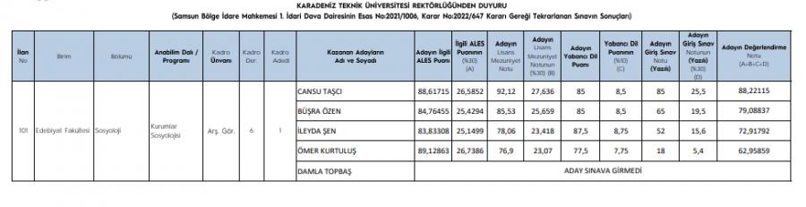 Samsun Bölge İdare Mahkemesi Kararı Gereği Tekrarlanan Sınavın Sonuçları