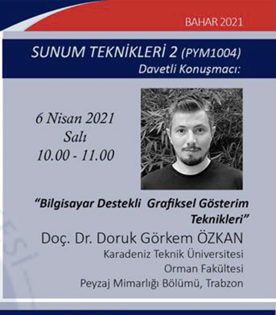 Bölümümüz öğretim üyelerinden, Doç. Dr. Doruk Görkem ÖZKAN Kırıkkale Üniversitesi Peyzaj Mimarlığı Bölümü lisans dersleri kapsamında davetli konuşmacı olarak “Bilgisayar Destekli Grafiksel Gösterim Teknikleri” başlıklı ders sunumu yapmıştır.