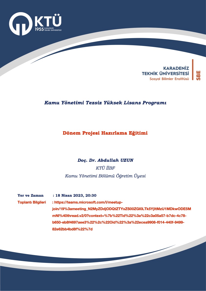 Kamu Yönetimi Tezsiz Yüksek Lisans Programı öğrencilerine yönelik Dönem Projesi Hazırlama Semineri düzenlenecektir. Katılmak için tıklayınız