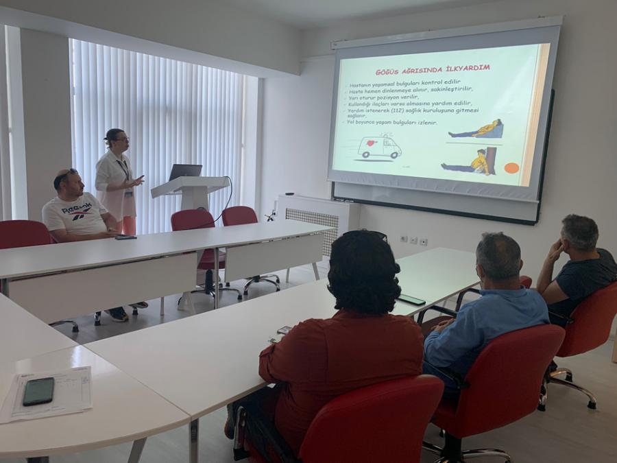Enstitümüz toplantı salonunda gerçekleştirilen hizmet içi eğitim kapsamında temel ilkyardım eğitiminde, İlkyardımın temel ilkeleri, hasta yaralı yaşam bulgularının değerlendirilmesi, şok, bayılma, göğüs ağrısı, kanama ve yaralanmalarda ilkyardım başta olmak üzere önemli bilgiler personelimize aktarıldı. Acil durumlarda hareket tarzı, haber verme ve bildirimde dikkat edilecek konular ele alındı.