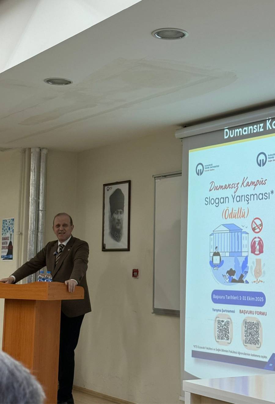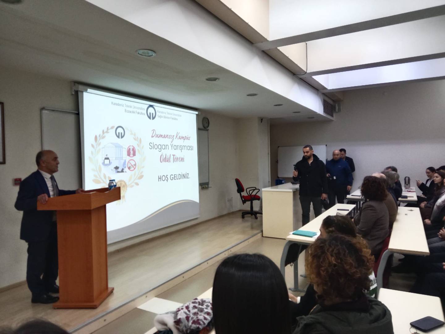 Fakültemiz ve Eczacılık Fakültesi tarafından 16.12.2025 Tarihinde “Dumansız Kampüs Slogan Yarışması” ödül töreni düzenlenmiştir. Törene Sayın Rektörümüz Prof. Dr. Hamdullah Çuvalcı, Rektör Yardımcısı Prof. Dr. Ali Temiz ve Prof. Dr. Bünyamin Er, Üniversite Yönetim Kurulu Üyeleri, Yeşilay Trabzon bölge müdürü Avukat Işıl Demir Güner, fakültelerimizin akademik ve idari personeli ve öğrenciler katılmıştır. Dereceye giren öğrencilerimizin ödülleri Rektörümüz Prof. Dr. Hamdullah ÇUVALCI tarafından takdim edildi.