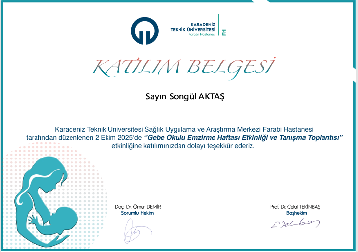 Ebelik Bölüm Başkanı Prof. Dr. Songül AKTAŞ, Üniversitemiz Farabi Hastanesi Gebe Okulu tarafından düzenlenen "Gebe Okulu Emzirme Haftası Etkinliği ve Tanışma Toplantısı" adlı etkinliğ katıldı. Toplantı Gebe Okulu Birim Sorumlu Hekimi Sayın Doç.Dr. Ömer DEMİR’in açılış konuşmasıyla başladı. Toplantıya Trabzon İl Sağlık Müdürü, Farabi Hastanesi Başhekimi, Farabi Hastanesi Başhemşiresi, İl ve İlçe Merkezlerden çok sayıda Ebe, Hekim ve Hemşire katıldı. Toplantıda Farabi Hastanesi Gebe Okulu Koordinatör Ebesi Sayın Dr. Tuğba YAZICI TOPÇU, yeni kurulan “gebe okulu ve emzirme faaliyetleri, emzirmede yenilikçi yaklaşımlar” konusunda konuşma yaptı. Katılımcı olarak katılan Bölüm Başkanı Prof. Dr. Songül AKTAŞ, toplantıda gebe okulu ve emzirme hizmetlerinde sürekli destekleyici ebelik bakımının önemi konusunda görüş ve önerilerini sundu.