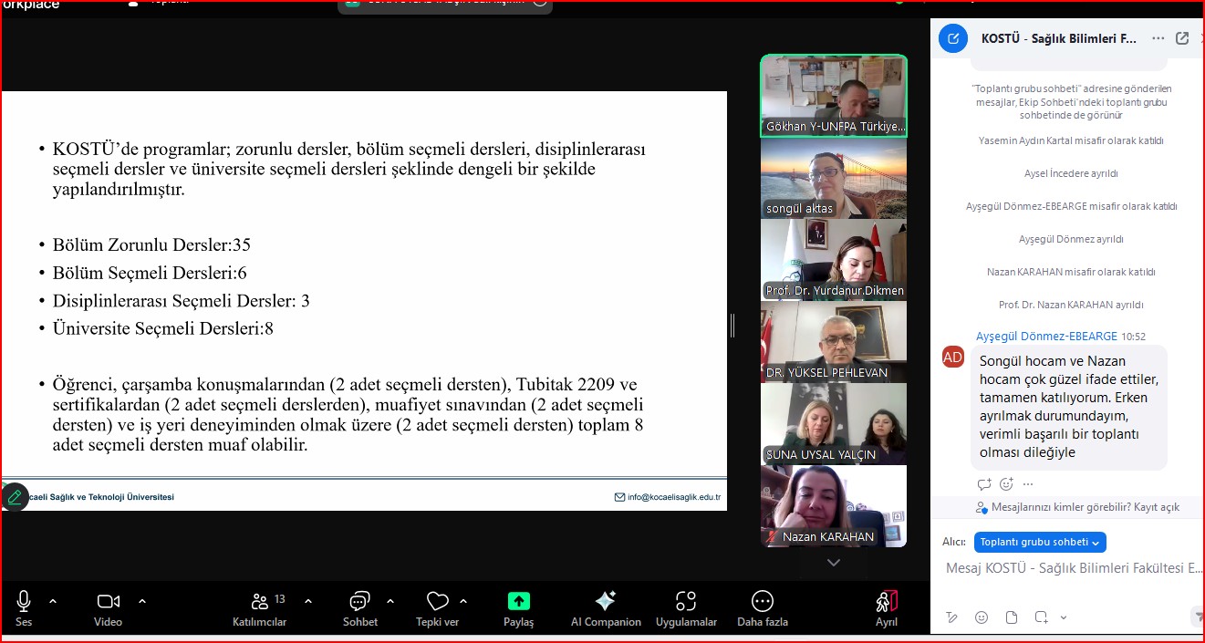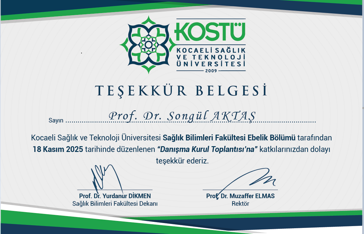 Ebelik Bölüm Başkanı Prof. Dr. Songül AKTAŞ, 18 Kasım 2025 tarihinde Kocaeli Sağlık ve Teknoloji Üniversitesi Sağlık Bilimleri Fakültesi Ebelik Bölümü Danışma Kurulu toplantısına katıldı. Fakülte Dekanı Sayın Prof. Dr. Yurdanur DİKMEN’in başkanlık ettiği toplantıya, Kocaeli İl Sağlık Müdürü, Türk Ebeler Derneği Başkanı, Ebelikte Araştırma Geliştirme Derneği Başkanı ve bir çok üniversitede akademisyen ve klinisyenler katıldı. Bölüm Başkanı Prof. Dr. Songül AKTAŞ, bu toplantıda bu üniversitede yeni kurulan Ebelik Bölümü’nün daha da güçlenmesine yönelik önerilerde bulundu. Toplantı iyi niyet ve temennilerle sonlandı.