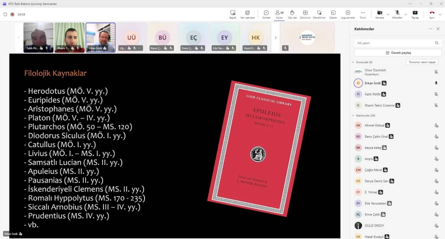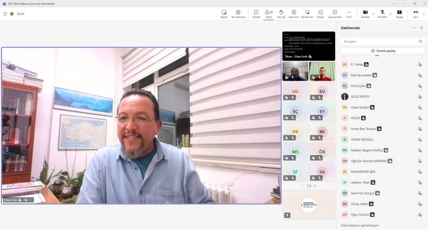 22.10.2025 tarihinde saat 20:00'da Anadolu Üniversitesi hocalarından Prof. Dr. Erkan İznik'in sunumu ile İlkçağın Sır Kültleri adlı çevrimiçi seminer KTÜ tarih bölümü hocaları ve öğrencilerinin de katılımı ile gerçekleştirilmiştir.