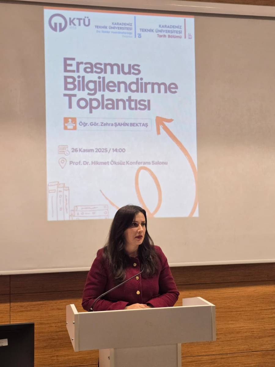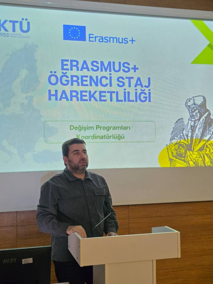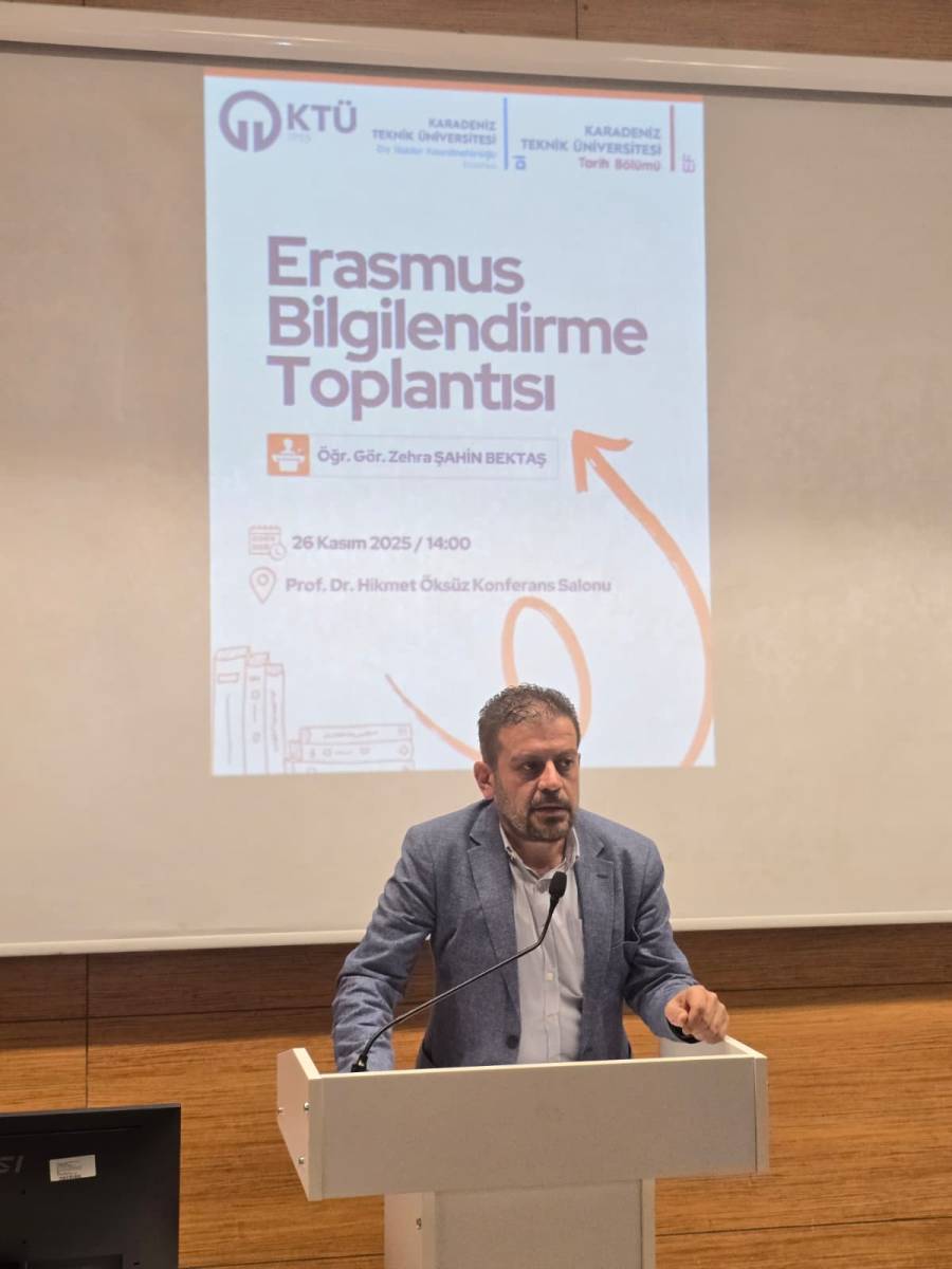 26.11.2025 tarihinde saat 14:00'da bölümümüz ve KTÜ Dış İlişkiler Koordinatörlüğü ile birlikte Erasmus Bilgilendirme Toplantısı yapılmıştır.