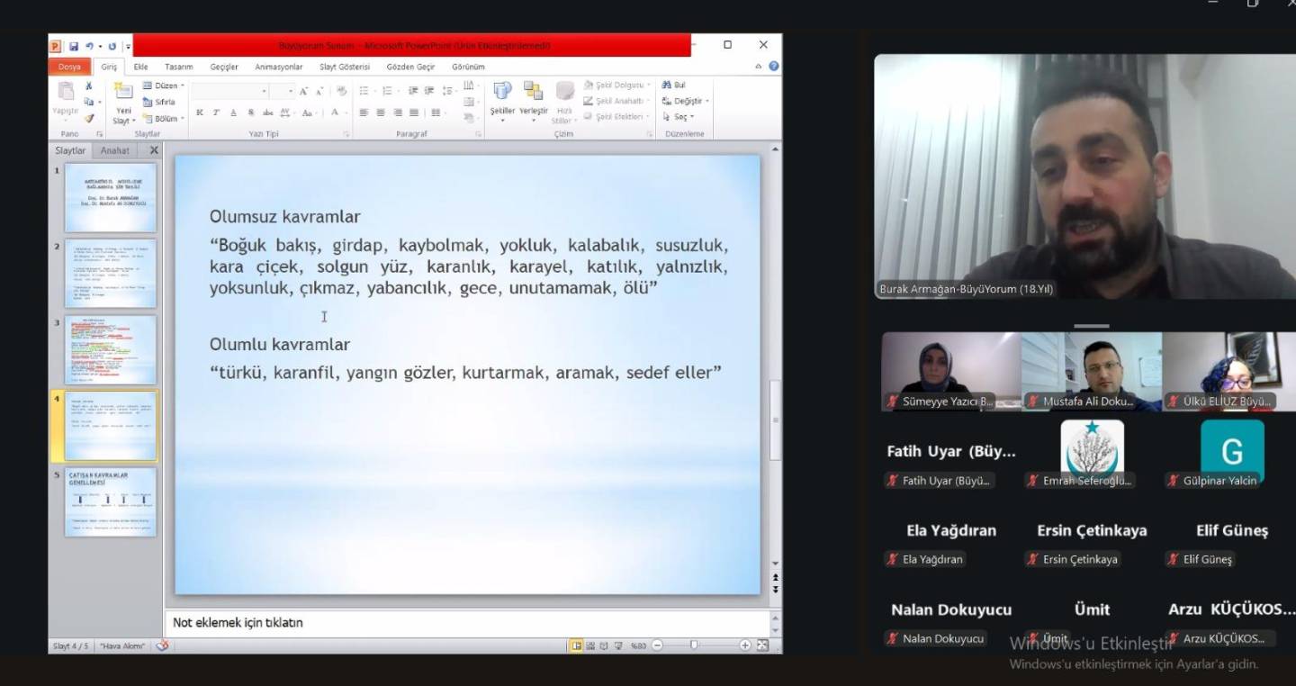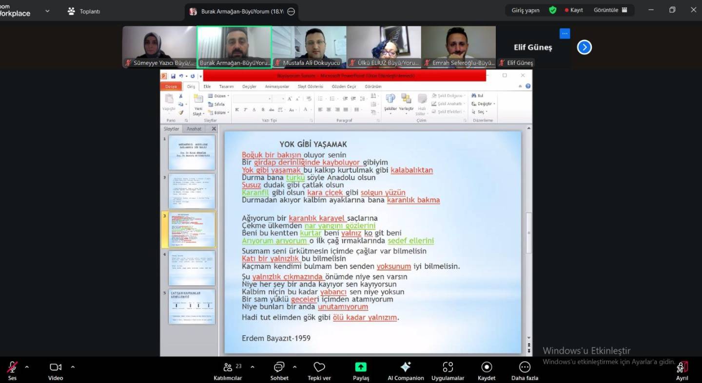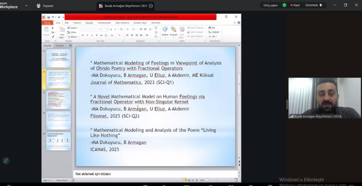 Büyü/Yorum Edebiyat Atölyesi Çevrim İçi Buluşmalar kapsamında Amasya Üniversitesi öğretim üyesi Doç. Dr. Burak ARMAĞAN ve 19 Mayıs Üniversitesi öğretim üyesi Doç. Dr. Mustafa Ali Dokuyucu, "Matematiksel Modelleme Bağlamında Şiir Tahlili" başlıklı sunumlarını gerçekleştirmiştir.