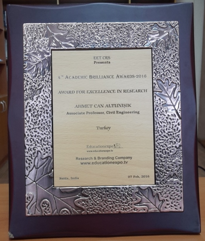 Karadeniz Teknik Üniversitesi, Mühendislik Fakültesi, İnşaat Mühendisliği Bölümü öğretim üyelerinden Doç. Dr. Ahmet Can ALTUNIŞIK, uluslararası 4th Academic Brilliance Awards-2016 (Akademik Mükemmelliyet Ödülleri) kapsamında, Award for Excellence in Research (Araştırmada Mükemmelliyet) ödülüne layık görülmüştür.